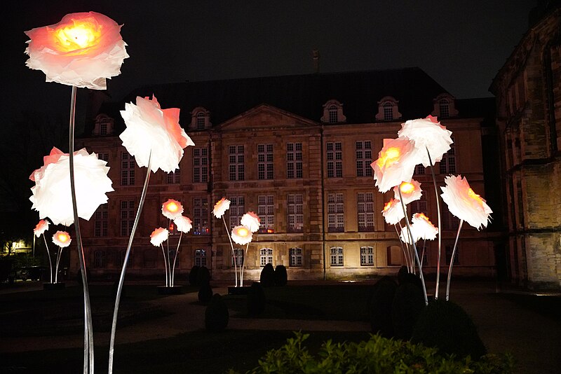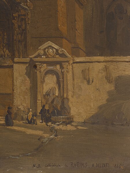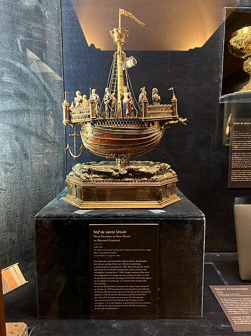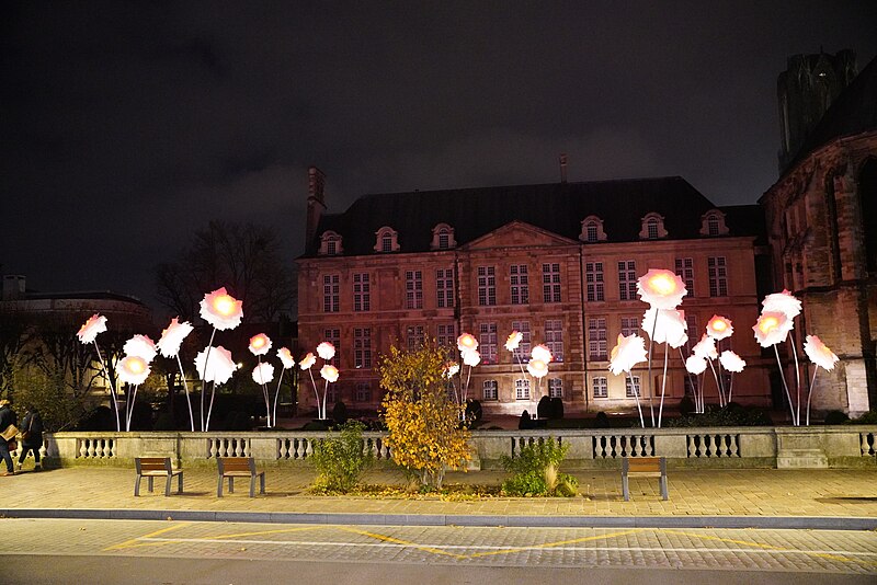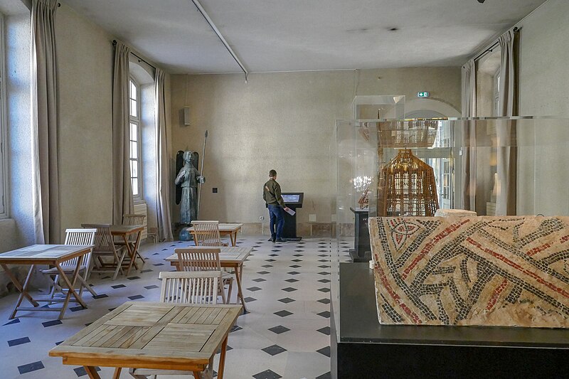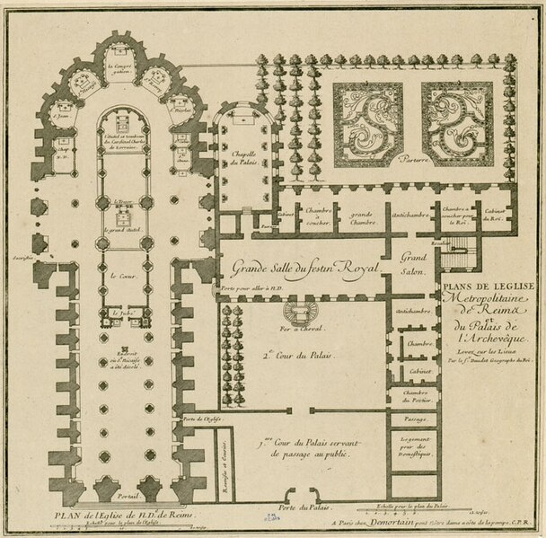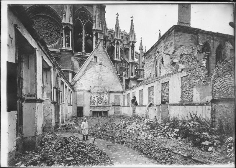 Le palais du Tau, ancien archevêché de Reims, tient son nom de la forme en T que présentait initialement sa salle principale. Implanté à côté de la cathédrale Notre-Dame, il fut longtemps la résidence des évêques et archevêques de Reims et accueillait les rois lors des cérémonies de sacre, la salle du Tau servant alors aussi de lieu de banquet. Le site est occupé depuis le Ve siècle ; des vestiges d'une villa gallo-romaine ont été découverts dans la salle basse du palais. Une chapelle palatine à deux niveaux, de style gothique, est attribuée à Jean d'Orbais et date de la période 1215-1235. La résidence a été agrandie et remaniée à plusieurs reprises, avec des transformations majeures à la fin du XVe siècle sous Guillaume Briçonnet et des aménagements classiques importants réalisés par Robert de Cotte à la fin du XVIIe siècle sous l'archevêque Charles-Maurice Le Tellier. Le palais perdit alors son aspect défensif, la tour d'Éon ayant déjà été détruite en 1648 par Léonore d'Estampes, et sa superficie fut considérablement augmentée, la grande salle perdant sa croisée et la composition des appartements étant réorganisée. Confisqué pendant la Révolution et transformé en tribunal puis en bourse de commerce, le bâtiment servit aussi de prison et vit son jardin converti en cour de détention. Restauré pour le sacre de Charles X et remanié dans un style néo-gothique, il abrita ensuite l'Académie de Reims et, au XIXe siècle, une importante bibliothèque et des expositions publiques. Après la séparation des Églises et de l'État, l'archevêque quitta le palais en 1906 ; l'édifice fut classé monument historique en 1907 et destiné à accueillir plusieurs musées. Le 19 septembre 1914, un incendie provoqué par le bombardement de la cathédrale ravagea le palais : la galerie des rois peints et l'essentiel des collections furent détruits, et à la fin de la guerre il ne restait guère plus que les façades et la chapelle. Utilisé comme atelier lors de la reconstruction de la cathédrale, le palais ne fut reconstruit qu'à partir de 1950 et réouvert au public en 1972 comme musée. En 1991, la cathédrale et le palais du Tau ont été inscrits au patrimoine mondial de l'UNESCO. Depuis 1972, le palais, géré par le Centre des monuments nationaux, abrite le musée de l'Œuvre et conserve d'importants éléments sculptés provenant de la cathédrale, des tapisseries anciennement exposées en l'édifice et des salles consacrées aux sacres des rois de France ; il accueille également des expositions temporaires et des manifestations culturelles. La salle du Tau, qui a perdu sa forme en T lors des travaux de Robert de Cotte et présente aujourd'hui un plan rectangulaire, conserve une cheminée ornée des armoiries de Guillaume Briçonnet mêlées à celles du chapitre de Reims ; sa charpente en bois, en forme de carène de navire inversée, a neuf poutres horizontales. La cheminée, épargnée par les bombardements de 1914, a été restituée dans l'état présumé du XVe siècle, et deux grandes tentures du XVe siècle illustrant l'Histoire du roi Clovis y sont exposées. Le trésor du palais est réparti dans deux pièces situées entre la salle du Tau et la chapelle haute : l'une présente des objets de l'Ancien Régime, l'autre des créations de la Restauration, parmi lesquelles figurent la sainte Ampoule et son reliquaire, le calice du sacre, le talisman dit de Charlemagne, le reliquaire de la Résurrection et la nef de sainte Ursule, ainsi que d'autres reliquaires médiévaux. La chapelle haute, classée monument historique depuis 1886, est accessible depuis la salle du Tau ; son entrée est surmontée d'un tympan représentant une Adoration des Mages et elle abrite notamment les six chandeliers et la croix réalisés par l'orfèvre Henri Auguste pour le mariage de Napoléon et de Marie-Louise. D'autres salles du palais exposent des sculptures, des ensembles tapisseries et des objets liturgiques et offrent un parcours illustrant l'histoire liturgique et artistique du lieu.