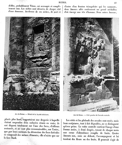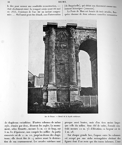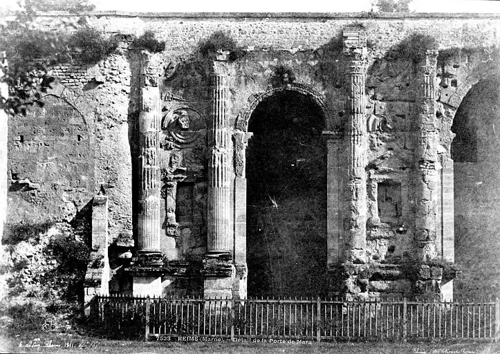 L'arc mesure 33 mètres de long, 13 mètres de hauteur actuelle — son entablement sommitale ayant disparu — et 6,40 mètres d'épaisseur ; il est constitué de trois arches bordées de piles ornées de colonnes. Entre les colonnes, la décoration comportait des niches à frontons triangulaires surmontées de médaillons à têtes en haut-relief, aujourd'hui très dégradés sauf sur la partie ouest reconstituée en 1854. L'intrados des voûtes, fortement altéré, présente néanmoins une représentation rare d'une moissonneuse faisant partie d'un calendrier des travaux des champs illustré par une série de médaillons montrant laboureurs, vendangeurs, moissonneurs, meunier, et autres activités agricoles. Sous l'arcade ouest, un médaillon carré représente la louve allaitant Romulus et Rémus, entourés du berger Faustulus et d'Acca Larentia, scène interprétée comme un rappel de la filiation entre Reims et Rome et liée à la légende locale attribuant la fondation de Reims à Rémus ou à ses compagnons. Sous l'arcade est, très abîmée, subsiste une représentation de Leda et de Zeus sous la forme d'un cygne, et au sol de l'arcade centrale sont visibles les sillons creusés pour guider les roues des véhicules. Contrairement à une idée répandue, la Porte de Mars n'est pas un arc de triomphe au sens romain du terme : les arcs de triomphe étaient réservés à Rome, les autres arcs antiques étant en réalité des monuments d'entrée.