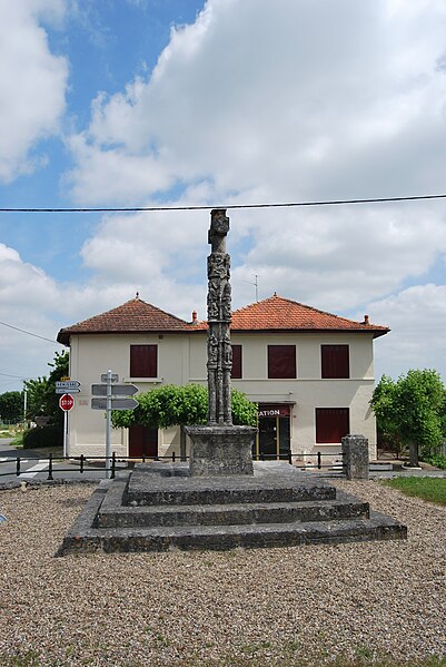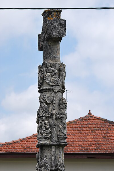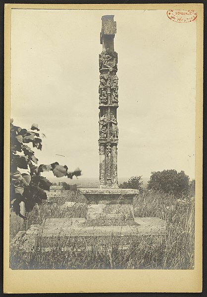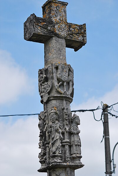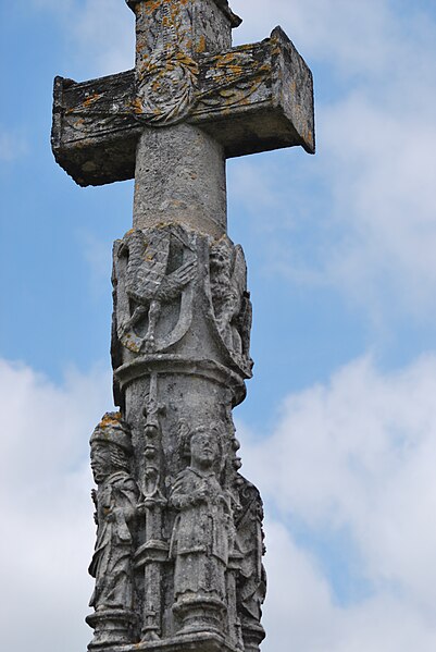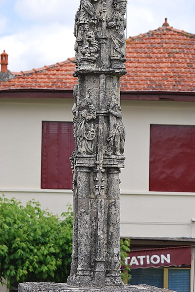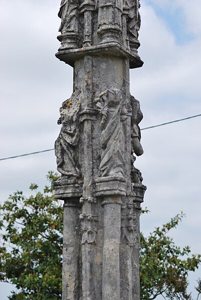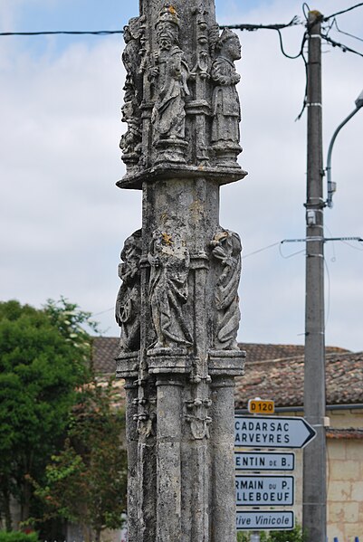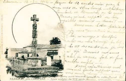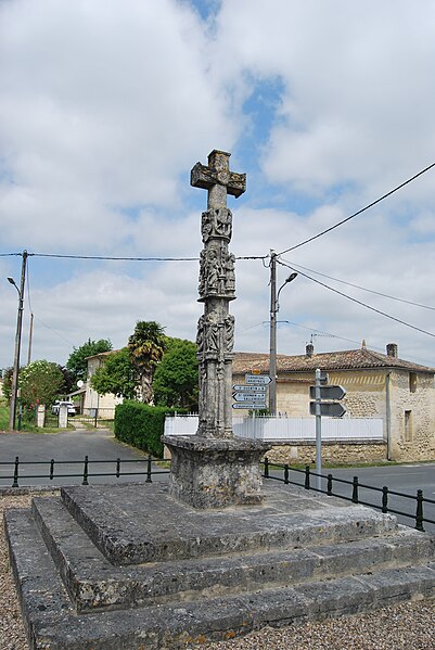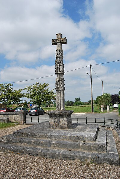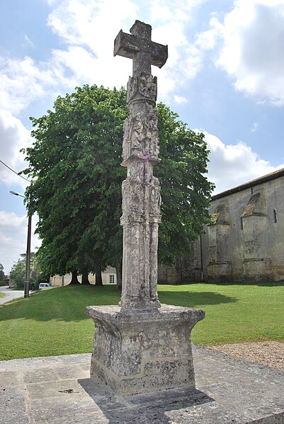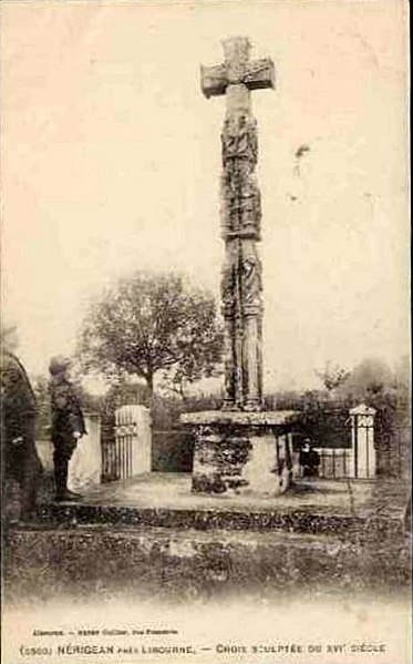 La croix de cimetière de Nérigean, située près de l'église Saint-Martin en Gironde, est une croix hosannière. Les croix de cimetière apparaissent à partir du XVe siècle et, placées au centre du cimetière, sont liées à la bénédiction des rameaux; elles sont le plus souvent l'œuvre de maîtres maçons et résultent de dons de seigneurs, mettant en évidence le saint patron de la paroisse par une représentation sommitale. Selon Léo Drouyn, cette croix est une copie ou une imitation presque exacte de celle de Saillans, probablement réalisée par le même artiste et portant la date de 1546. Sa base carrée repose sur trois marches larges et hautes, ce qui confère au monument une certaine élégance. La croix sommitale a été remplacée par une croix en pierre réalisée par un maçon local. Contrairement à l'exemplaire de Saillans, les statuettes ne sont pas surmontées de dais, mais les ornements et leur disposition sont similaires : au sommet du fût figurent les attributs des évangélistes, et immédiatement en dessous se trouvent quatre statuettes — l'ange Gabriel, saint Paul, saint Michel et saint Pierre. Les quatre statuettes inférieures représentent sainte Madeleine, sainte Catherine, saint Jean et une quatrième sainte figurée liée à un arbre par les pieds et les mains. La croix est classée au titre des monuments historiques depuis le 20 décembre 1907.