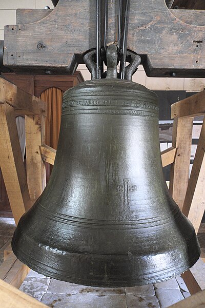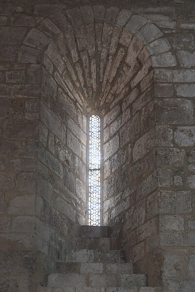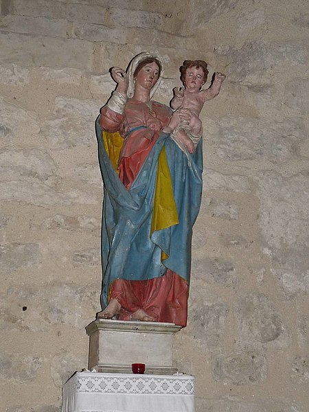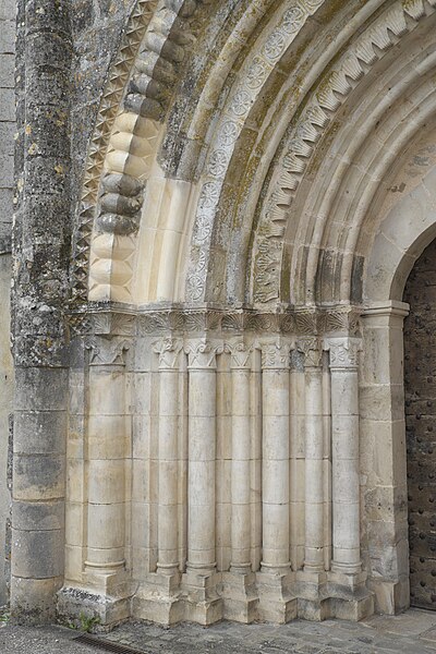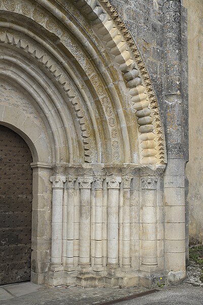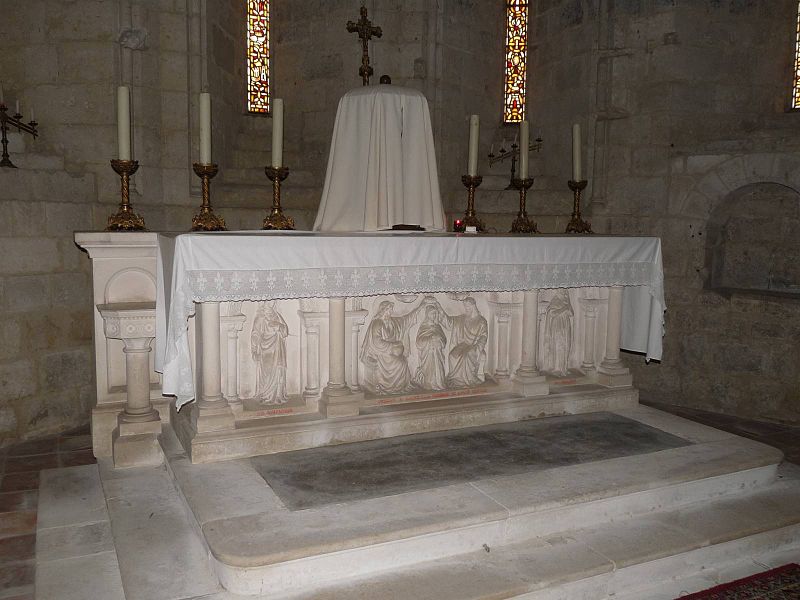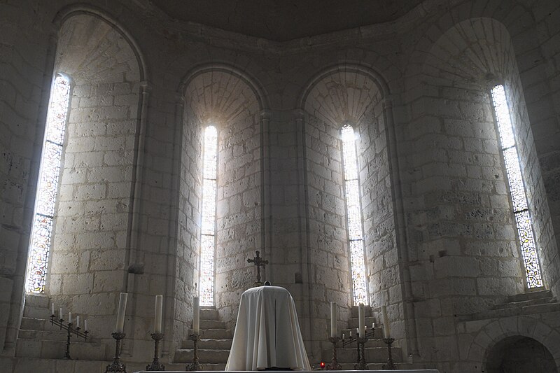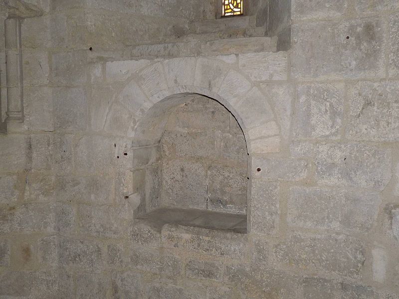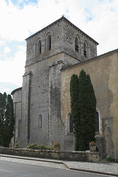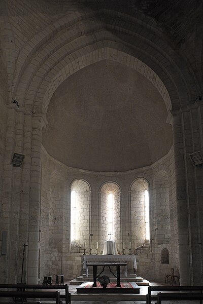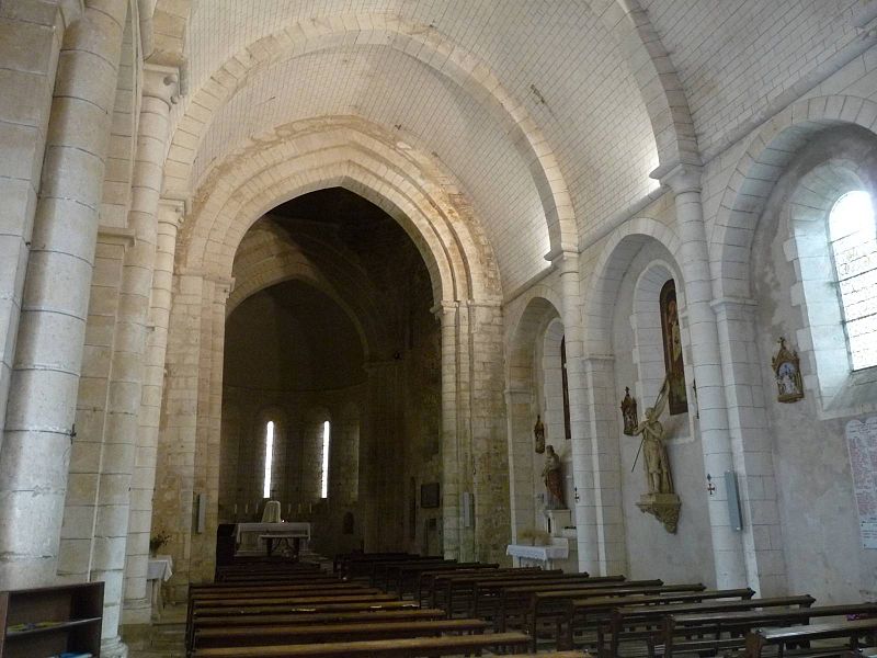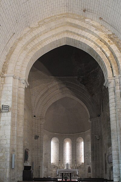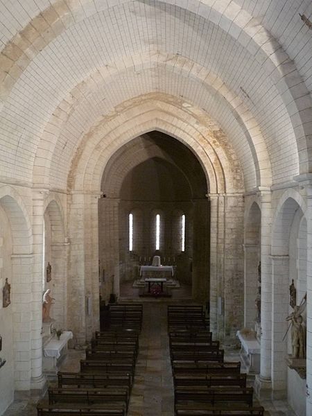 La nef est voûtée en berceau et portée par quatre arcs doubleaux brisés qui délimitent huit travées. Une travée oblongue, couverte d'une coupole, supporte le clocher. La nef s'achève par une abside à sept pans voûtée en cul-de-four, formée par la pénétration des demi-berceaux prolongeant les pans. L'entrée, située au nord de la nef, est encadrée par quatre rangées de claveaux moulurés et décorés, surmontées d'un bandeau d'archivolte. La coupole est octogonale, les pans d'angle correspondant aux pendentifs. L'étage des cloches, de plan rectangulaire, s'ouvre sur chaque face par deux lancettes traitées en double rang de claveaux ; le rang extérieur repose sur des colonnettes et est surmonté d'une archivolte. Chaque pan de l'abside comporte une étroite lancette à large chanfrein extérieur et à fort ébrasement, avec un boudin sur l'arête. Aux arêtes extérieures de l'abside se dressent des contreforts étroits dont la face antérieure présente deux plans parallèles aux murs. En partie haute des murs, un bandeau est surmonté d'une surélévation en moellons qui supporte la couverture et paraît destinée davantage à recevoir la charpente qu'à fortifier l'édifice.