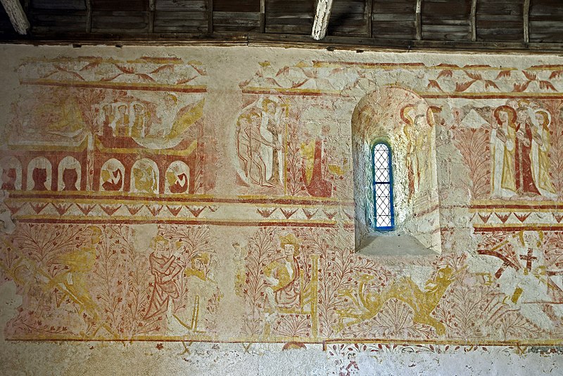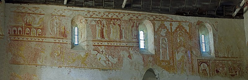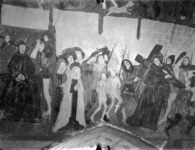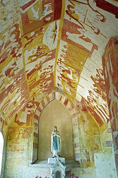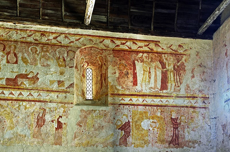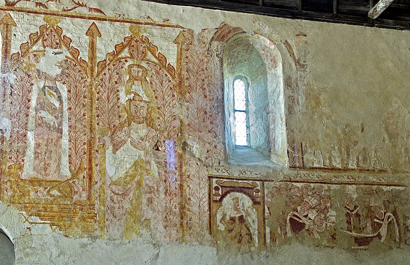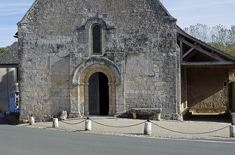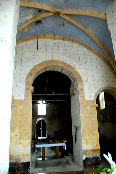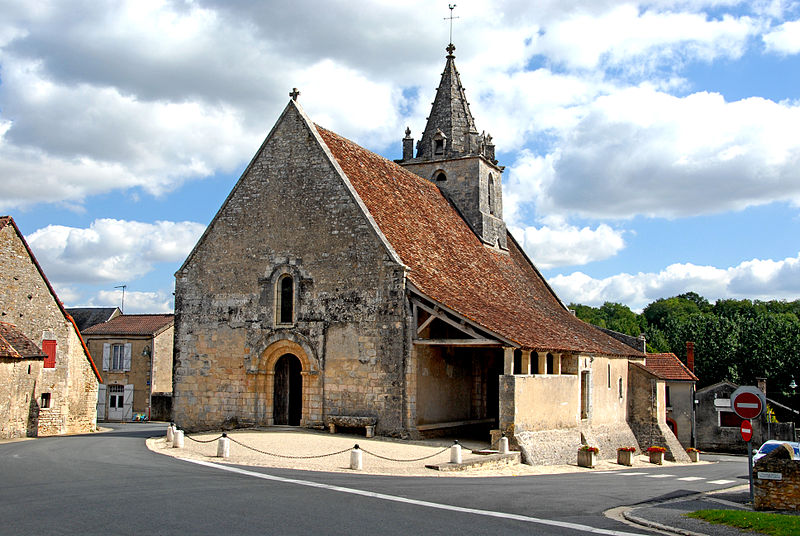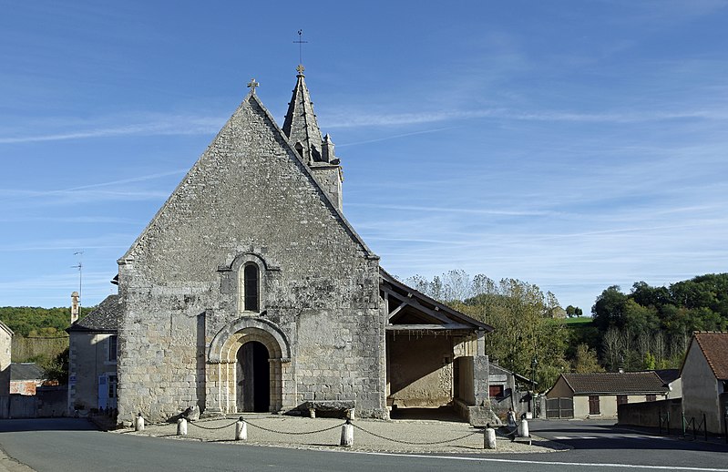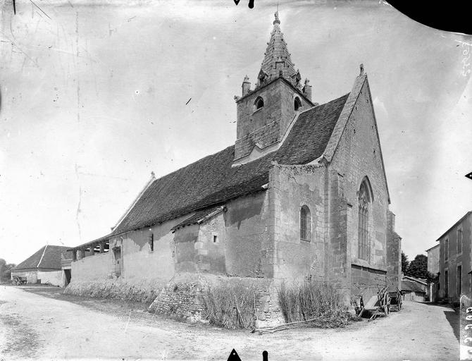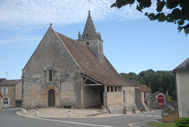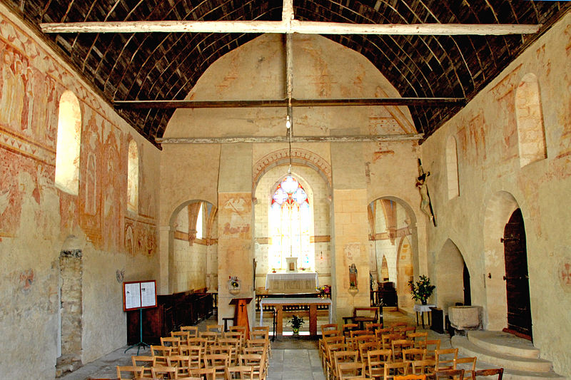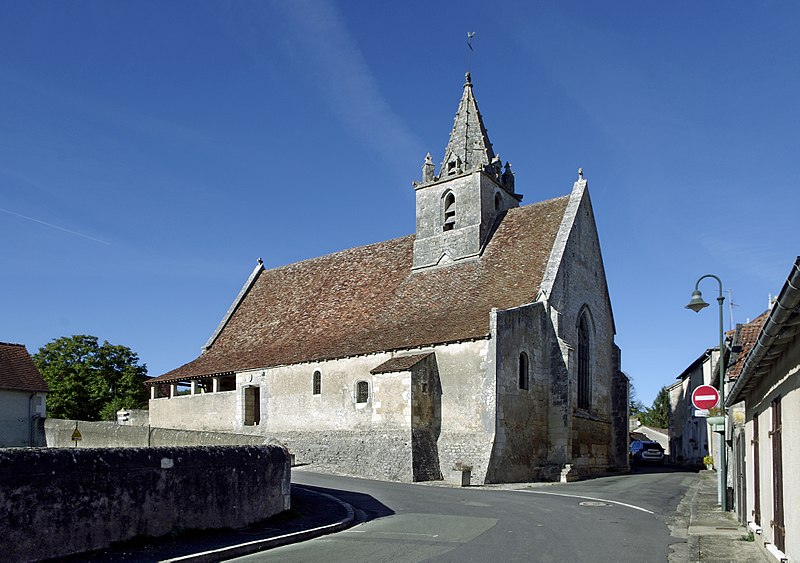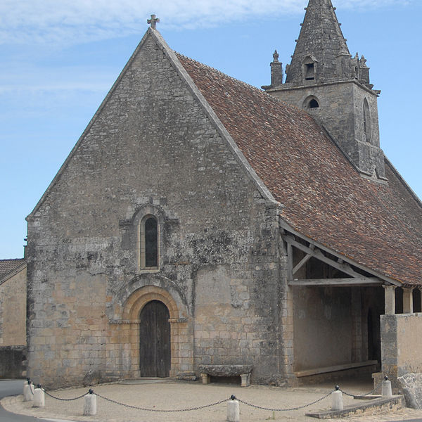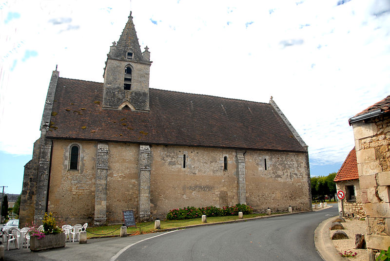 Petit édifice datant de la fin du XVe siècle. L'église présente une nef unique romane du XIIe siècle, couverte par une voûte en bois, et un chœur de deux travées voûtées d'arêtes. Ces espaces sont traversés en leur centre par deux piliers carrés qui supportent l'une des faces du clocher. Le chœur se termine par un chevet carré, éclairé par une fenêtre à trois meneaux. À droite s'ouvrent sur la nef et le chœur deux chapelles voûtées en berceau ; la seconde, chapelle seigneuriale, conserve un cycle de fresques du XVe siècle. Le clocher, en pierre et de plan carré, est surmonté d'une flèche octogonale dont les arêtes sont décorées de crochets, et aux angles se dressent quatre amortissements à pinacles. L'église comporte par ailleurs un chevet triple plat attribué aux XIIIe ou XIVe siècles et un petit clocher sur ce chevet, couvert d'un toit polygonal en pierre.