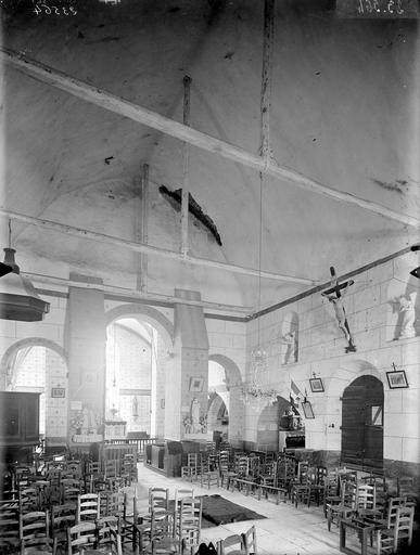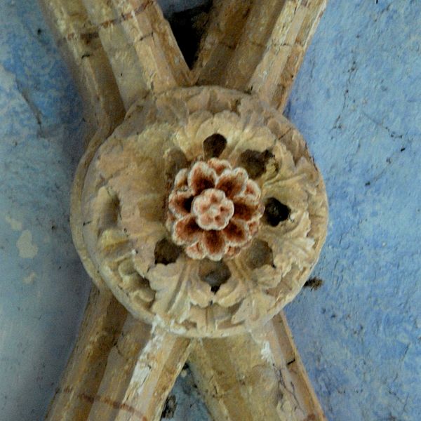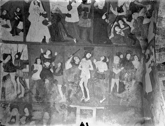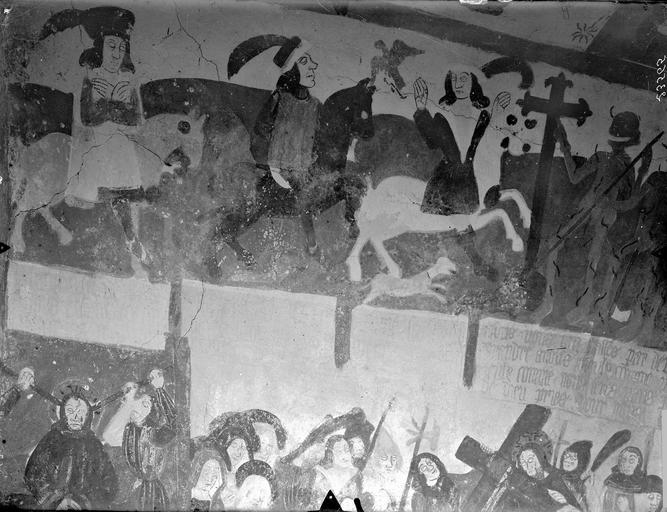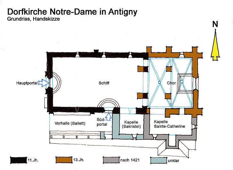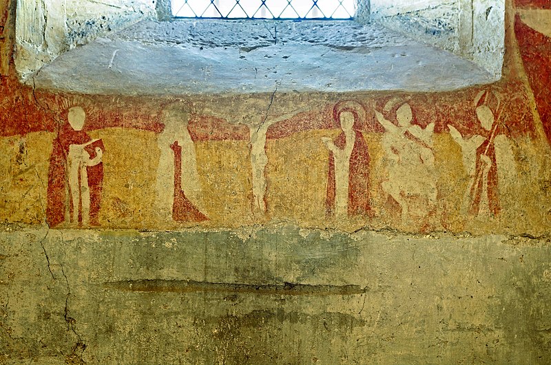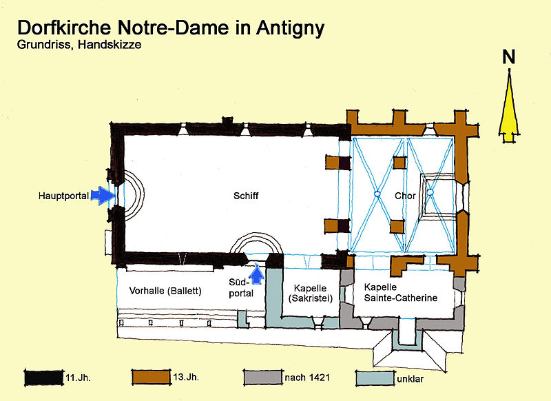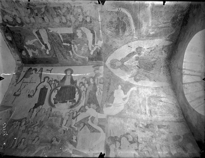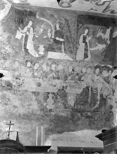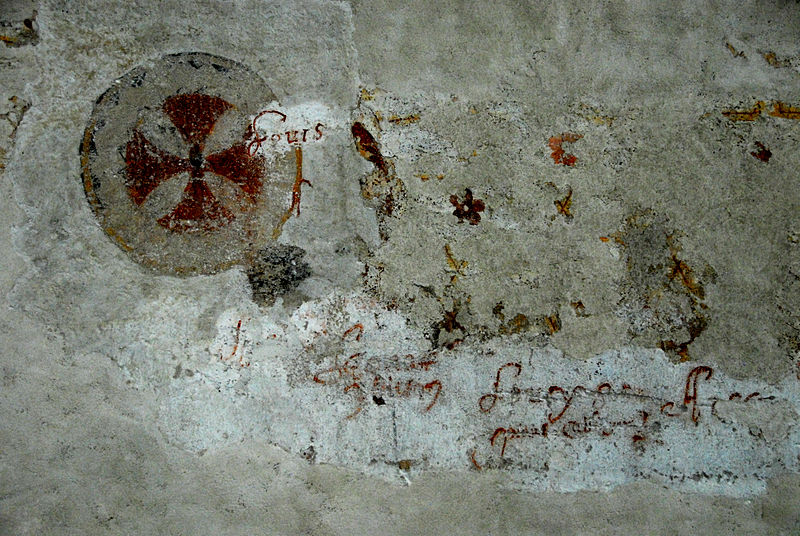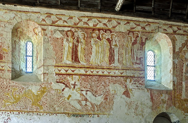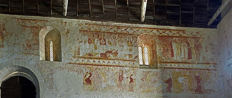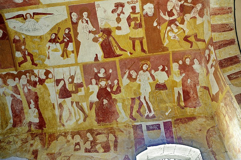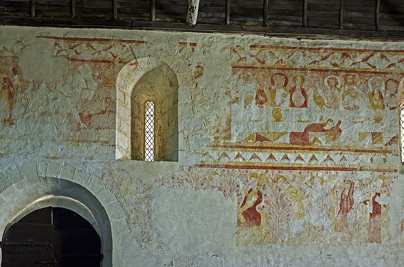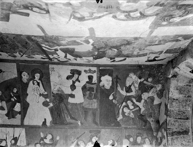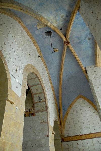 Petit édifice datant de la fin du XVe siècle. L'église présente une nef unique romane du XIIe siècle, couverte par une voûte en bois, et un chœur de deux travées voûtées d'arêtes. Ces espaces sont traversés en leur centre par deux piliers carrés qui supportent l'une des faces du clocher. Le chœur se termine par un chevet carré, éclairé par une fenêtre à trois meneaux. À droite s'ouvrent sur la nef et le chœur deux chapelles voûtées en berceau ; la seconde, chapelle seigneuriale, conserve un cycle de fresques du XVe siècle. Le clocher, en pierre et de plan carré, est surmonté d'une flèche octogonale dont les arêtes sont décorées de crochets, et aux angles se dressent quatre amortissements à pinacles. L'église comporte par ailleurs un chevet triple plat attribué aux XIIIe ou XIVe siècles et un petit clocher sur ce chevet, couvert d'un toit polygonal en pierre.
