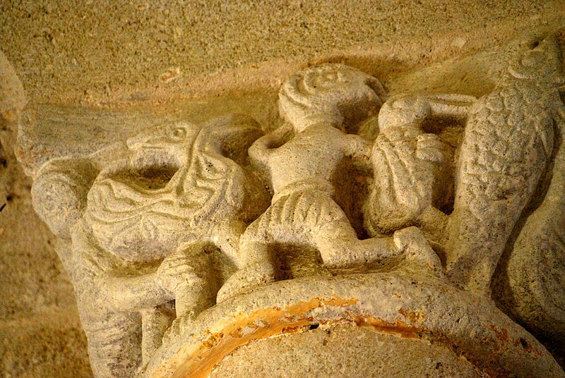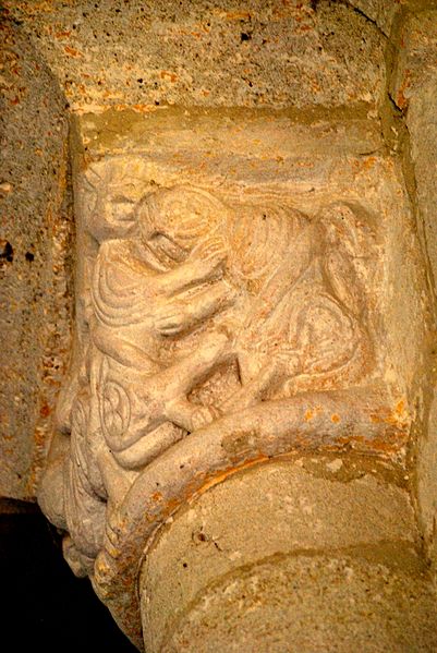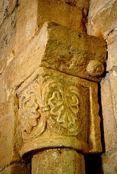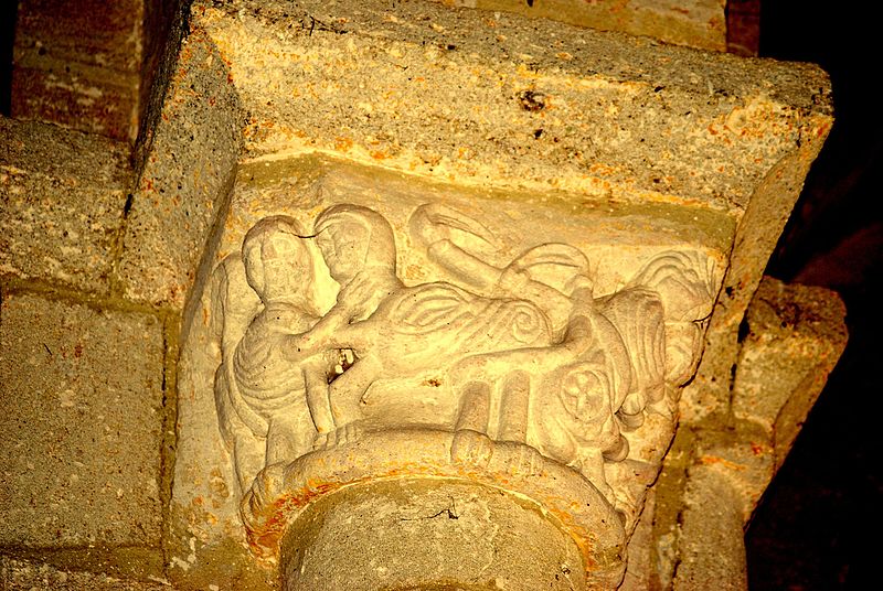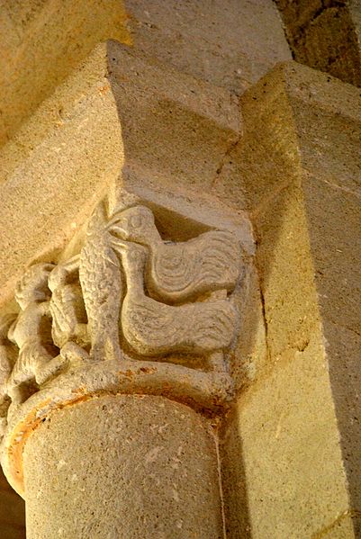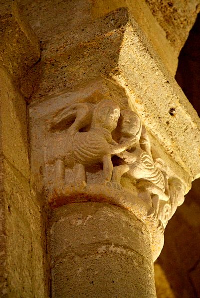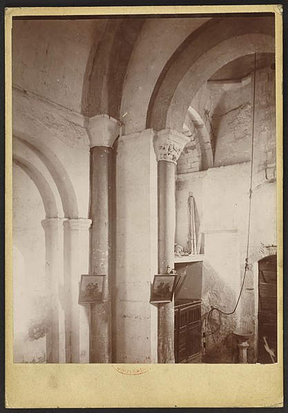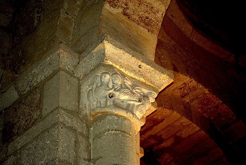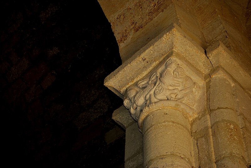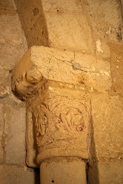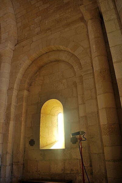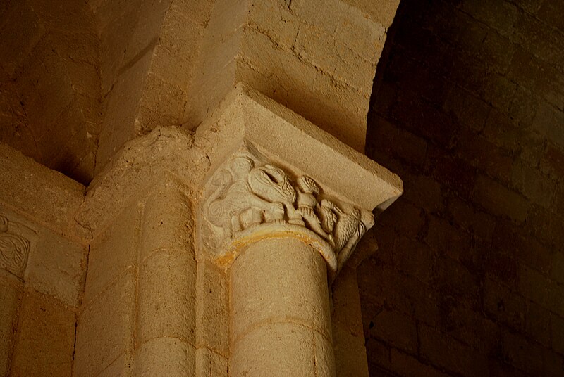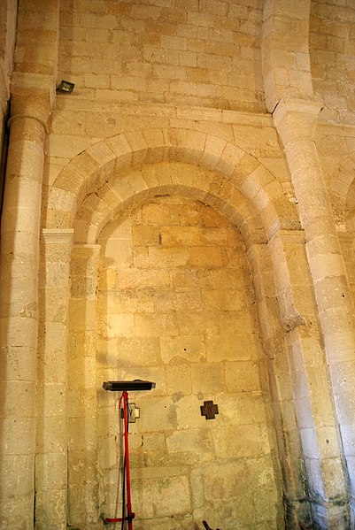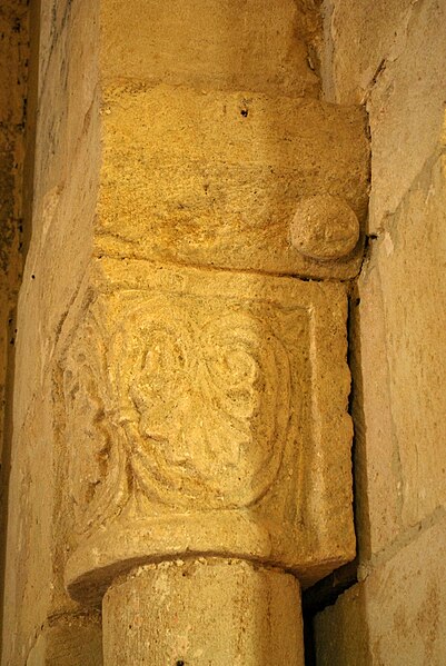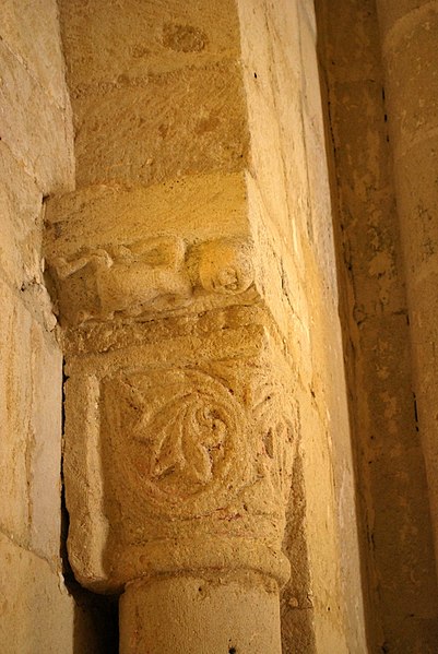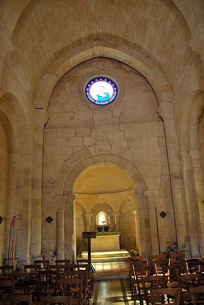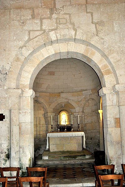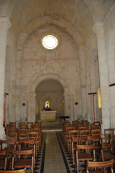 À l'intérieur, chaque flanc de la nef est rythmé par trois arcades en plein cintre à deux voussures ; la première travée, sous le clocher, est couverte par une coupole, tandis que les deux travées orientales portent une voûte ogivale en pierre renforcée par trois doubleaux. L'arc triomphal est orné de chapiteaux à décor de feuillages ; d'autres chapiteaux historiés se situent à l'entrée de la nef et dans le sanctuaire, où trois chapiteaux romans présentent feuillages ou entrelacs. Les chapiteaux historiés de l'entrée illustrent des scènes moralisatrices et des créatures hybrides ; certains tailloirs de l'arc triomphal portent encore des figures partiellement martelées, motifs destinés à rappeler au clergé les vœux de chasteté.