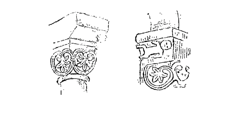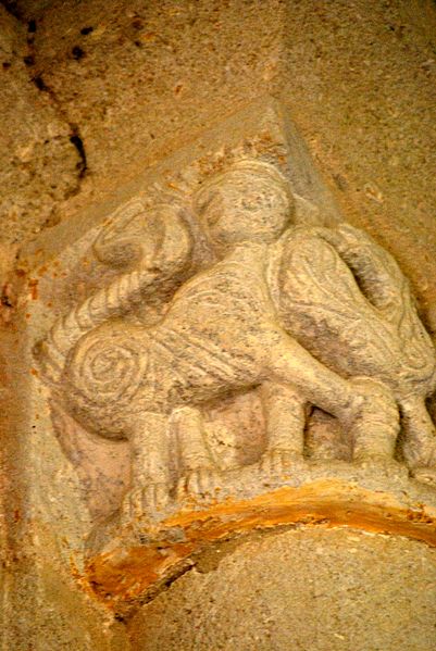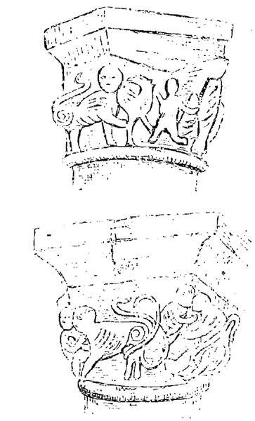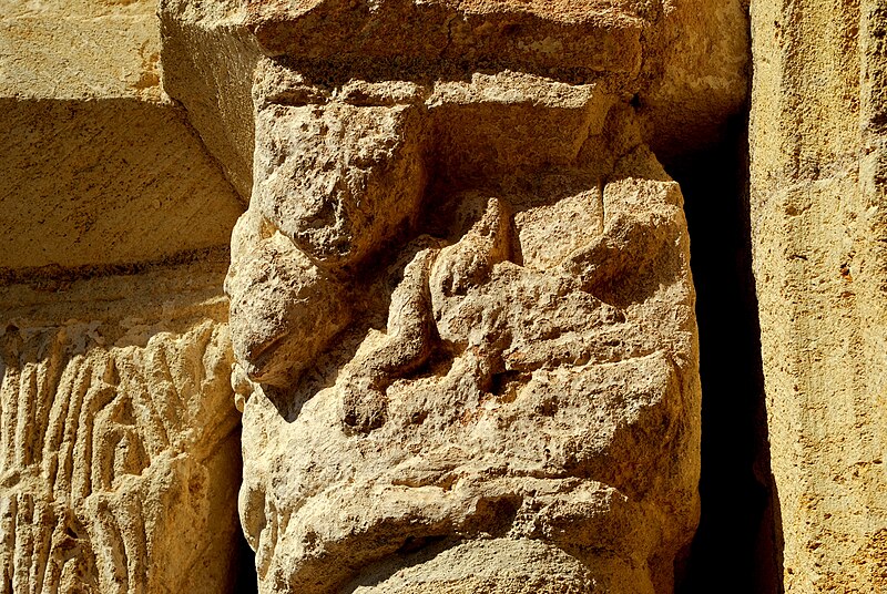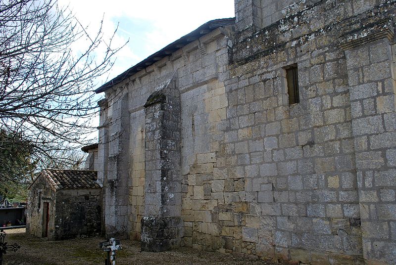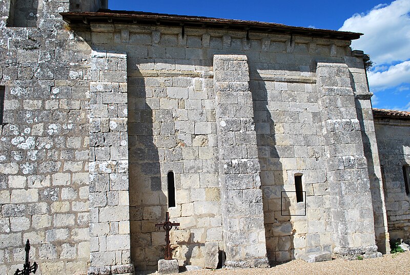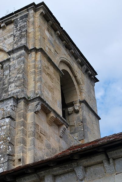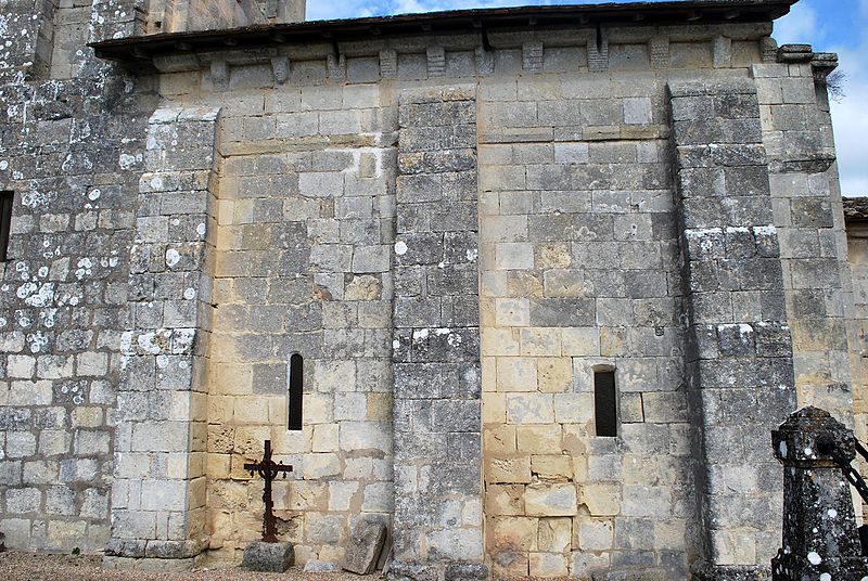 Les modillons de la corniche, souvent très érodés ou fragmentés, offrent néanmoins un répertoire figuré et symbolique caractéristique : têtes humaines aux visages paisibles, homme renversé, musiciens, créatures hybrides, motifs géométriques et scènes satiriques comme une bête portant une hostie, interprétée comme motif d'eucharistie sacrilège. Leur état varie selon les façades ; certains modillons ont été martelés ou modernisés. La nef, flanquée de contreforts, s'éclaire par un oculus à l'est et par des baies ogivales au sud ; le mur nord conserve les traces de deux anciennes fenêtres romanes bouchées. Sur la façade sud se lisent deux cadrans canoniaux, cadrans solaires primitifs utilisés pour repérer les heures liturgiques.