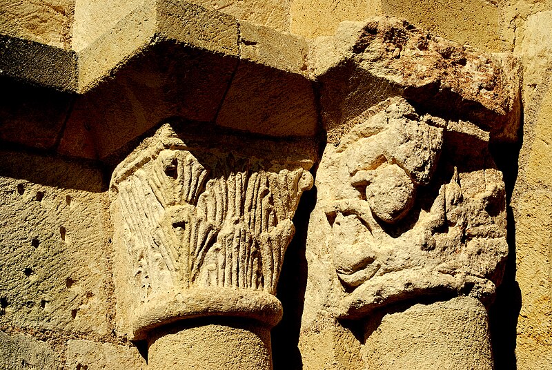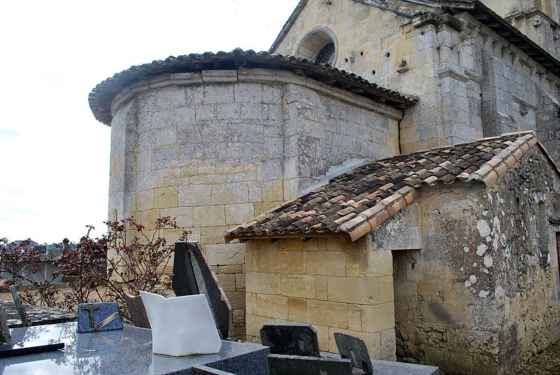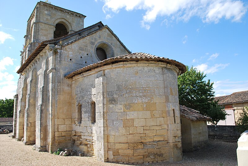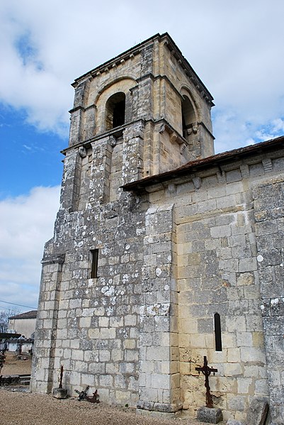 Le portail occidental, remanié à l'époque gothique, conserve des chapiteaux romans à décor de feuillages et des corbeilles historiées, bien que certaines sculptures protégées auparavant par un porche aujourd'hui disparu soient très érodées. Le clocher, de plan barlong et à deux étages séparés par une corniche à modillons, renferme deux coupoles superposées : la coupole du rez‑de‑chaussée, très allongée, repose sur des arcs en plein cintre et des pendentifs ; la coupole supérieure présente un galbe aplati qui ne correspond guère aux calottes médiévales apparentes.