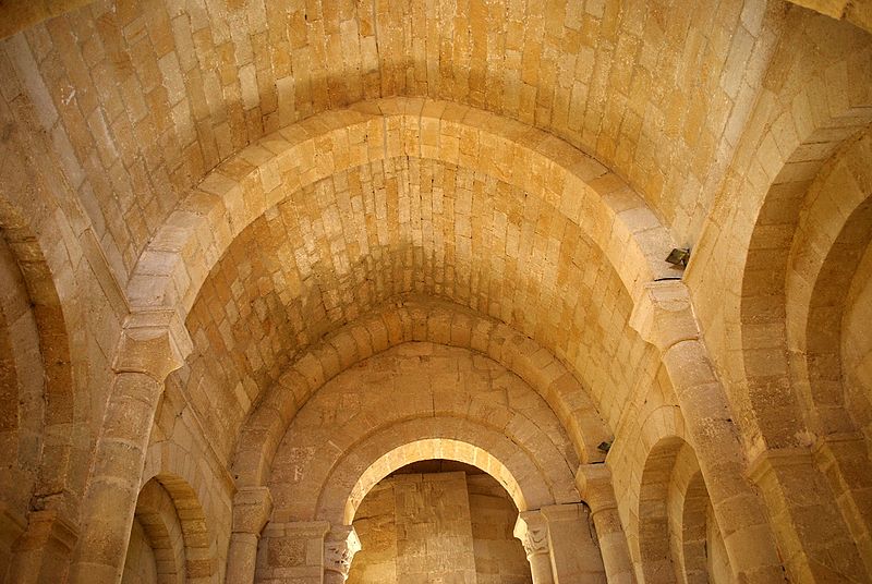 Le plan est simple : une nef de 15 m sur 4,30 m divisée en trois travées voûtées, une tour‑clocher à l'ouest et une abside en hémicycle. La première phase, au XIe siècle, correspond à une nef unique charpentée et à un chevet primitif remplacé ensuite par l'abside actuelle ; la tour occidentale, prévue dès l'origine pour recevoir une coupole, est élevée au début du XIIe siècle ; dans la seconde partie du XIIe siècle la nef charpentée est voûtée par l'adjonction d'arcs de décharge et de trois doubleaux reposant sur des piles coiffées de chapiteaux cubiques. L'arc diaphragme à double rouleau ouvre le mur oriental de la nef sur l'abside voûtée en cul‑de‑four, articulée extérieurement en sept pans par des arcatures sur colonnes. Sous le clocher, la travée porte une coupole ovoïde tandis que les deux autres travées reçoivent une voûte en berceau brisé ; un large oculus a été pratiqué entre l'arc triomphal et le berceau pour compenser une différence de niveau.