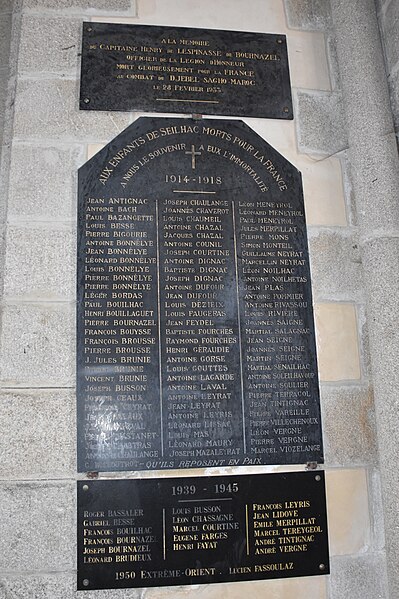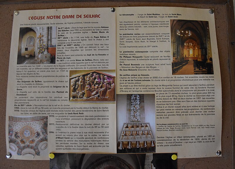 L'église Notre-Dame de Seilhac (Corrèze) est attestée dès le Xe siècle dans un legs au monastère de Tulle sous le nom de Sainte-Marie de Seilhac. Une bulle de 1154 mentionne une seconde église, qui devint le siège d'une prévôté dépendant de l'abbaye de Tulle. De l'édifice roman primitif subsiste essentiellement l'abside à pans coupés, dont le larmier repose sur des corbeaux sculptés de figures. La travée du chœur conserve, à l'intérieur, de beaux chapiteaux historiés. Les chapelles latérales, qui forment un faux transept, sont d'époque gothique ; la chapelle sud a été remaniée au XIXe siècle. La nef fut détruite par un incendie vers 1660 ; le reste de l'édifice fut reconstruit vers 1880. En 1955, la flèche fut détruite par un incendie provoqué par la foudre. L'abside à pans coupés et le chœur ont été inscrits au titre des monuments historiques en 1977. À l'extérieur, on note le clocher, le portail principal, la façade en partie occultée par un tilleul et les modillons du chevet. L'intérieur présente la nef et son approche par le porche, le chœur, des peintures du chevet et un bénitier. Plusieurs statues sont classées au titre des monuments historiques : saint Eutrope, saint Jacques le Majeur, saint Roch, saint Jean‑Baptiste et une Vierge de Pitié.