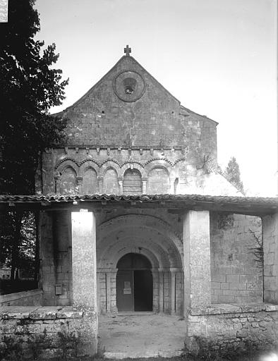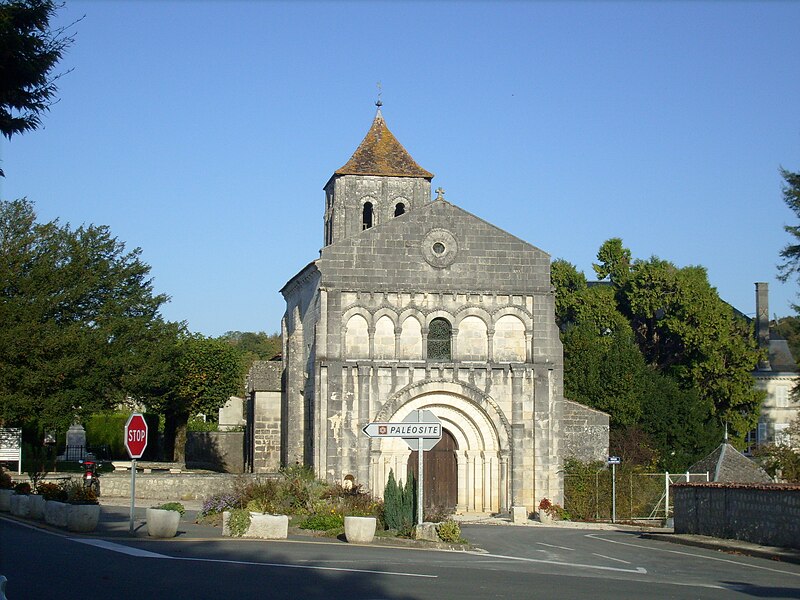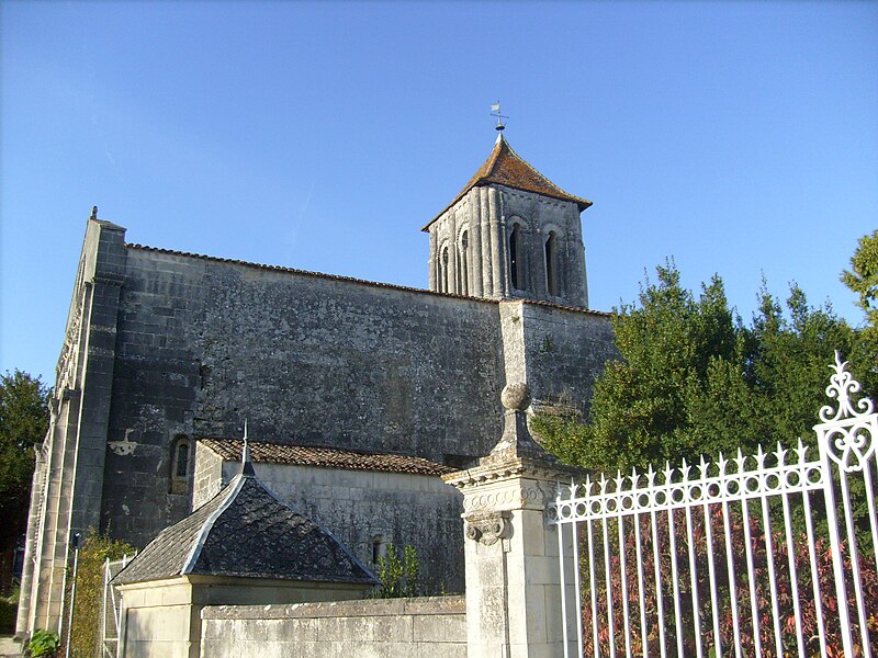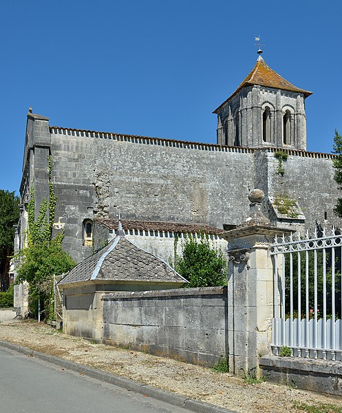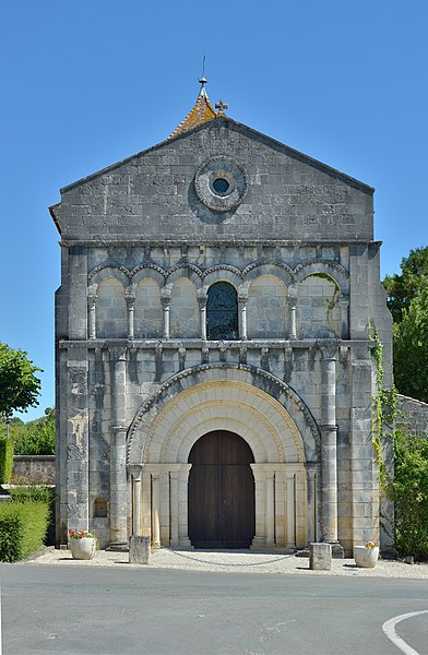 L'église Saint-Cézaire, de style roman saintongeais, se situe à Saint-Césaire en Charente-Maritime (Nouvelle-Aquitaine). Elle a été construite au XIIe siècle, classée au titre des monuments historiques le 4 septembre 1913 et entièrement restaurée en 1935. La façade occidentale s'ouvre sur un portail à quatre archivoltes, couronné de couvre-joints à dents de loup et de têtes de clous ; au-dessus se développent de petites arcatures aux couvre-joints sculptés, puis une tablette formant corniche portée par des corbeaux sculptés. La galerie d'arcatures qui surmonte le portail présente, de part et d'autre de la fenêtre centrale, trois baies en arcs brisés à gauche et deux baies en plein cintre à droite, ces deux dernières occupant ensemble la même largeur que les trois de gauche. Le clocher, élevé sur la coupole et coiffé d'un toit pyramidal, comporte un étage carré percé sur chaque face de deux ouvertures séparées par des colonnettes simples. La nef a connu plusieurs campagnes de voûtement : elle était autrefois en berceau sur arcs doubleaux, puis des voûtes renversées furent remplacées au XVe siècle par des voûtes appuyées sur arcs diagonaux et formerets. La travée centrale est surmontée d'une coupole portée sur pendentifs et renforcée par des arcs doubleaux et des formerets ; le passage du plan circulaire au plan carré s'opère au moyen de deux groupes de colonnes surmontés d'arcades. La travée centrale et le sanctuaire sont voûtés sur doubleaux, diagonaux et formerets reposant, pour le sanctuaire, sur des colonnes prismatiques sans chapiteaux (fin XVe siècle). Par ailleurs, la nef à deux travées avait été voûtée d'ogives, mais cette voûte fut détruite au cours des guerres de Religion. Au début du XXe siècle existait encore un narthex adossé à la façade, où se tenaient les catéchumènes ; ce narthex a aujourd'hui disparu.