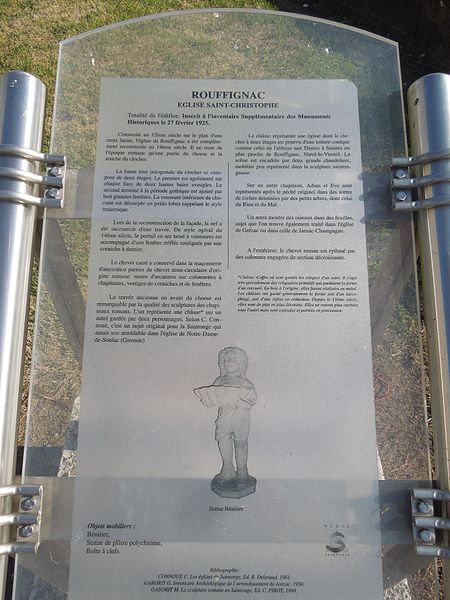 Située à Rouffignac (Charente‑Maritime, Nouvelle‑Aquitaine), l'édifice mentionné dans le texte est désigné comme l'église Saint‑Christophe. Le bâtiment est décrit comme étant en croix grecque, doté d'une abside rectangulaire et d'un clocher octogonal élevé sur la croisée du transept ; l'historique précise toutefois qu'il a été édifié sur un plan de croix latine puis entièrement reconstruit au XIVe siècle. L'église a échappé à la destruction pendant les guerres de religion parce qu'elle relevait directement du roi et non des seigneurs locaux. Elle est inscrite au titre des monuments historiques par un arrêté de 1925.