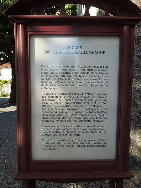 L'église Saint-Cyr, située à Saint-Ciers-Champagne en Charente-Maritime (Nouvelle-Aquitaine), est inscrite au titre des monuments historiques par arrêté du 5 avril 1935. La nef est couverte d'une fausse voûte moderne, mais conserve les départs des voûtes d'ogive du XIVe siècle. Des demi-piliers à colonnettes reliées par des gorges témoignent du style gothique rayonnant. Le clocher latéral, implanté au sud, est voûté d'ogives. Au premier étage de chacune de ses faces s'ouvre une fenêtre en arc brisé à redents ; le deuxième étage est percé de baies divisées par un meneau, chaque rectangle accueillant un arc tréflé inscrit. À chaque niveau, les angles sont amortis par une colonnette. La façade extérieure a été remaniée, à l'exception d'une arcature gothique conservée près du portail.