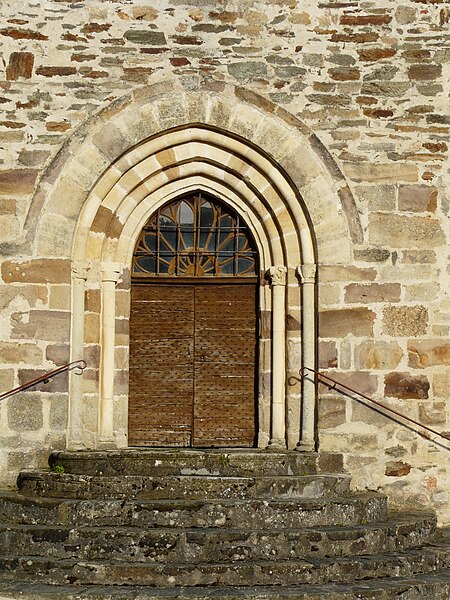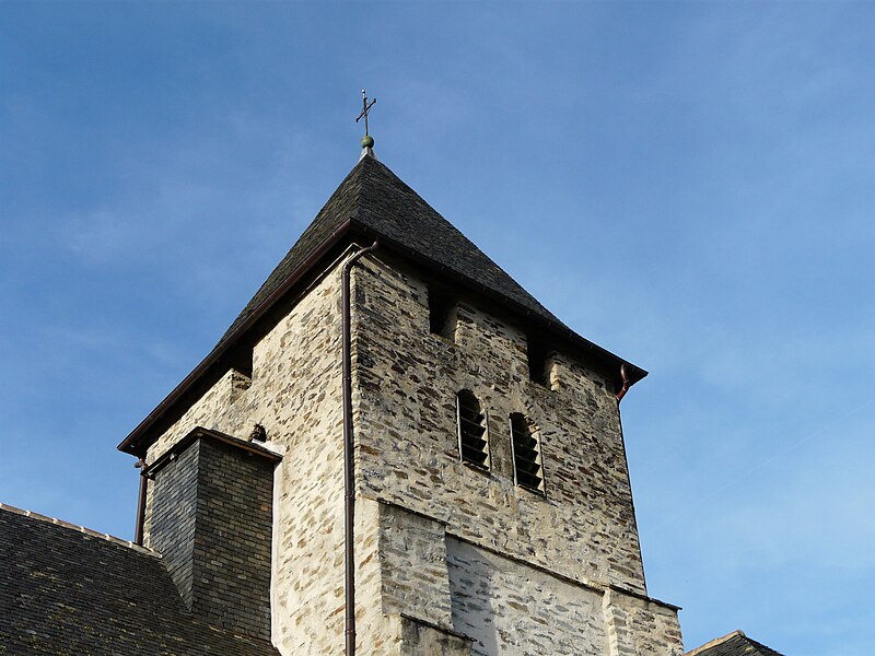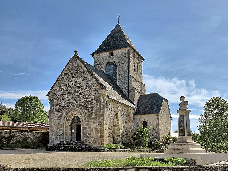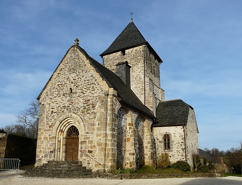 L'ancienne paroisse et son église dépendaient de la châtellenie et de l'archiprêtré de Ségur. L'édifice se compose d'une courte nef, suivie d'un avant-choeur sous coupole, flanquée de chapelles plus récentes (XVIIe siècle) formant un transept, et d'un chœur allongé. La nef est la partie la plus ancienne et remonterait probablement à la fin du XIe siècle ; elle comportait à l'origine au moins trois travées voûtées en berceau, mais le dévers des murs en a provoqué l'effondrement. Après cet effondrement, et sans doute la ruine de la partie orientale, une travée sous coupole octogonale a été greffée à l'est de ce qui subsistait de la nef. L'avant-choeur a dû être reconstruit vers le milieu du XIIe siècle. Le portail de la façade ouest présente trois voussures en tiers point ornées de tores, qui retombent sur quatre colonnettes aux chapiteaux sculptés de feuillage et d'un homme portant un fardeau. Un clocher carré s'élève au-dessus de l'avant-clocher.