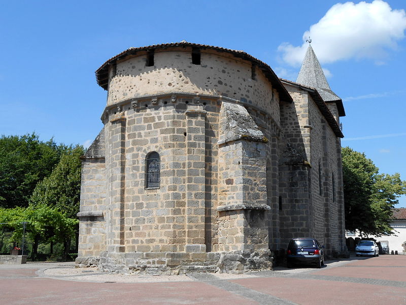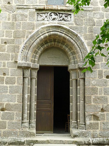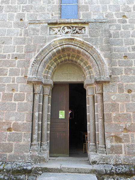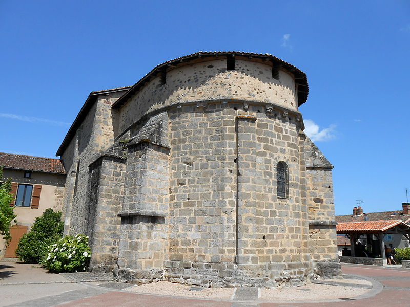 L'église Saint-Étienne, anciennement rattachée au diocèse de Limoges, est construite en granite, matériau caractéristique de la Marche limousine. L'édifice primitif remonte pour une large part à la seconde moitié du XIIe siècle, mais son aspect général a été modifié au cours des guerres de Cent Ans. Il présente une nef unique et une abside orientée ; la nef a sans doute été reconstruite à une époque indéterminée, tandis que la façade occidentale et l'abside conservent en grande partie leur silhouette du XIIe siècle. L'abside, à sept pans coupés, a été surélevée par un chemin de ronde et la pente de sa couverture a été remaniée. À l'intérieur, elle adopte un plan semi‑circulaire et est couverte d'une première travée droite en berceau aigu, à laquelle, vers l'est, succède une voûte en cul‑de‑four. L'angle sud‑ouest de la nef est occupé par le massif du clocher. La façade occidentale s'ouvre sur une porte à double voussure, soulignée par des boudins qui retombent sur des chapiteaux posés au sommet des colonnettes des piédroits. Au‑dessus de cette porte, un encadrement à ressaut abrite un bas‑relief représentant l'Agneau nimbé, tenant dans une gloire portée par des anges.