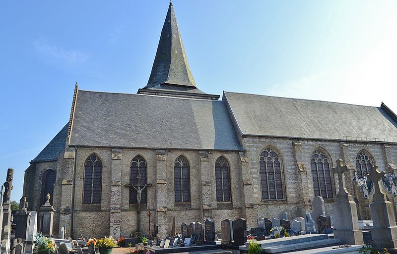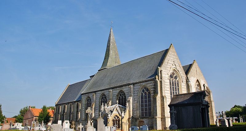 L'église Saint-Folquin tient son nom de Folquin, cousin de Charlemagne et évêque de Thérouanne, qui fut l'évangélisateur local. Du premier édifice roman, peut-être du XIe siècle, ne subsistent que la nef et la tour. En 1550, au XVIe siècle, la nef a été doublée du côté nord, puis prolongée au milieu du XVIIe siècle. En 1889, une sacristie a été ajoutée au chevet sud. En 1904, la famille Oudendyck a fait construire, en excroissance de la nef nord, une chapelle funéraire de style néogothique.