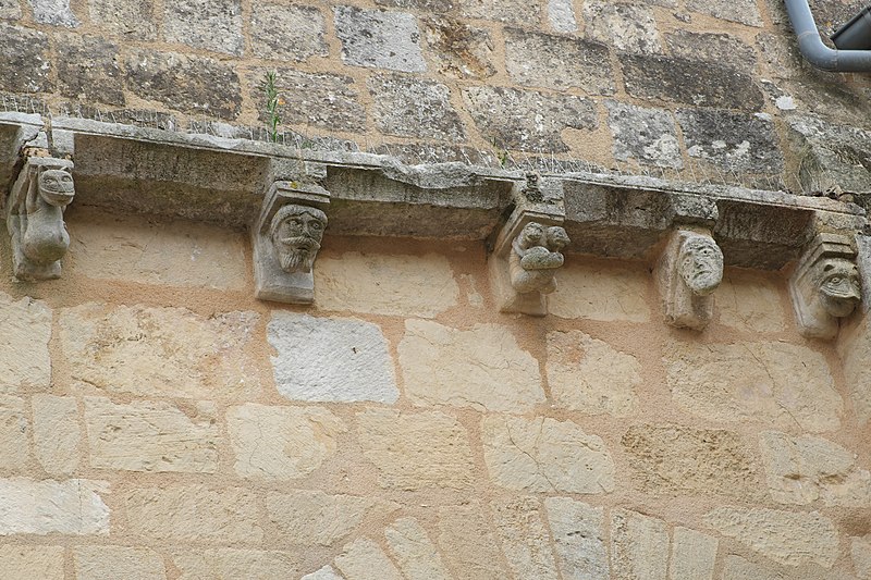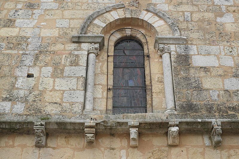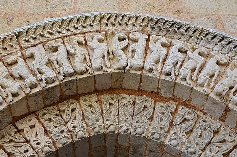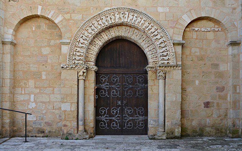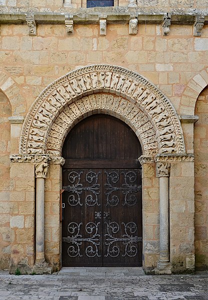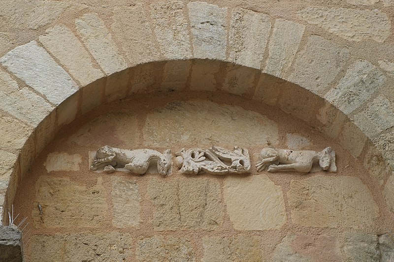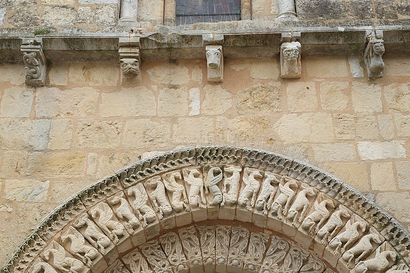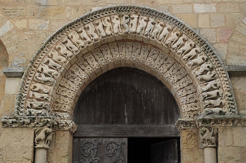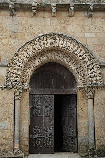 Le portail, daté du XIIe siècle, est cintré par deux rouleaux de claveaux en pierre sculptés et protégé par une archivolte moulurée. Les claveaux de l'arc de tête sont tous ornés d'un animal câbré évoquant un hippocampe.