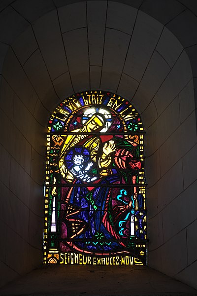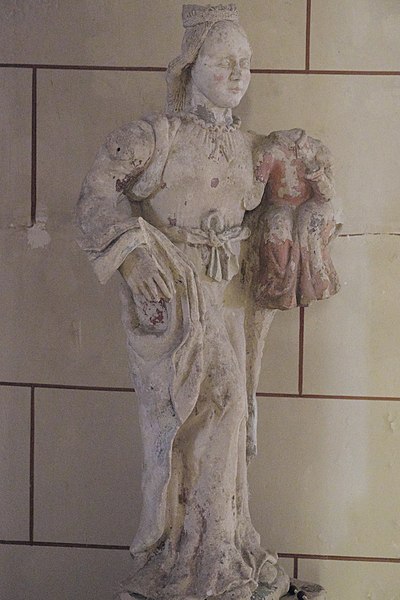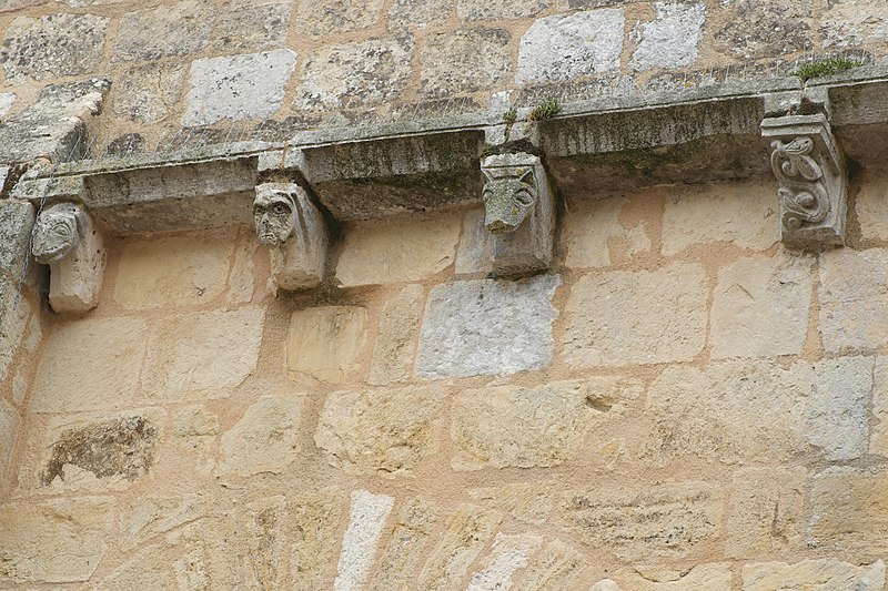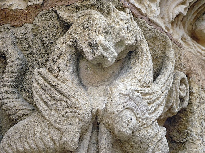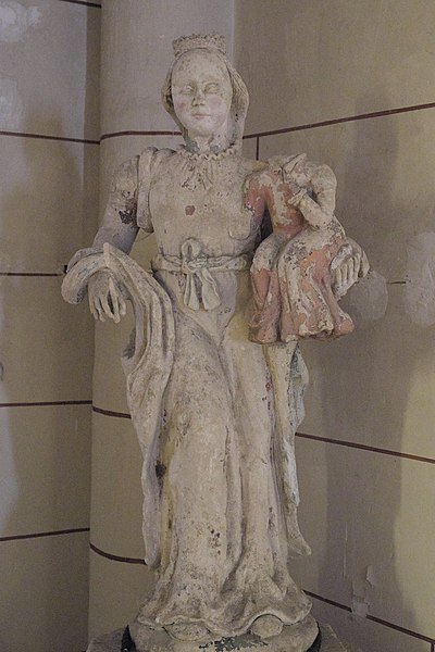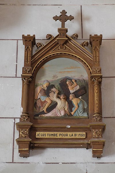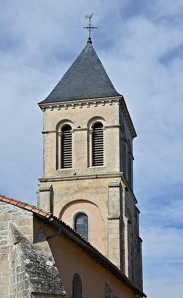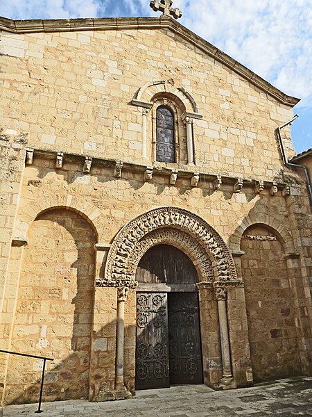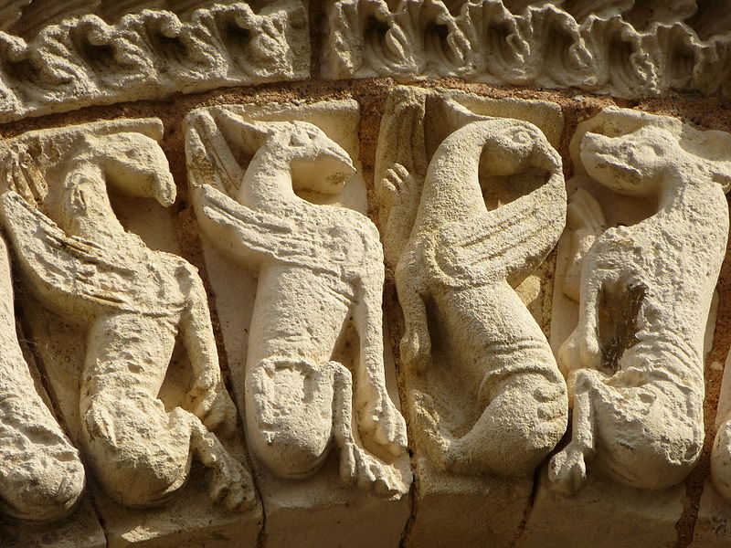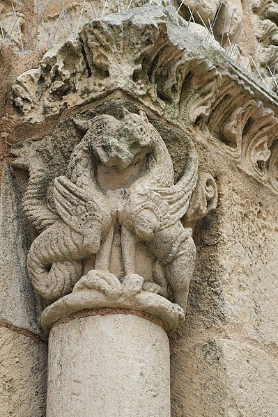 Le portail, daté du XIIe siècle, est cintré par deux rouleaux de claveaux en pierre sculptés et protégé par une archivolte moulurée. Les claveaux de l'arc de tête sont tous ornés d'un animal câbré évoquant un hippocampe.