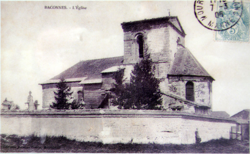L'église de Baconnes, dédiée à saint Memmie (Memmie de Châlons), est située à Baconnes, dans le département de la Marne, et est classée monument historique. Massif bâtiment en carreaux de craie et en pierre, elle présente une nef sans bas-côtés ni piliers : il s'agit d'une salle plafonnée percée d'une rangée de fenêtres en plein cintre, trois de chaque côté. Le chœur, arrondi en cul-de-four, relève d'un roman assez archaïque qui ne remonterait pas au-delà du XIIe siècle. La croisée du transept est soutenue par quatre massifs de colonnettes munies de chapiteaux d'exécution soignée. Les bras du transept se composent de deux petites chapelles très basses et exiguës, voûtées de larges ogives sans clé de voûte, chacune éclairée différemment : l'une par un oculus, l'autre par une petite fenêtre romane. L'abside, très réduite, est ajourée par trois fenêtres en plein cintre et voûtée de branches d'ogive qui s'arrêtent sur des consoles placées entre les fenêtres. Le portail occidental se réduit à une porte en plein cintre surmontée d'un oculus. La tour, à bâtière, a une forme large et courte, comme écrasée ; chacune de ses faces, sauf l'ouest, est ouverte par des baies inégales : une au sud et à l'est, et deux au nord, géminées sur des colonnettes ornées de chapiteaux à palmettes. La cloche pèse environ 400 kg et porte la date de 1568 ; l'inscription y mentionne maître Thomas Martin, curé de Baconnes, Rémi Charpentie, Domance Francoise Catherine Raulet et « Katrine », ce dernier nom pouvant être un nom de baptême. L'église se trouve sur une petite butte près du cimetière, conserve des fonts baptismaux et a subi des dégâts pendant la Première Guerre mondiale ; la vue de la nef vers l'abside illustre l'ensemble de ces caractéristiques.
