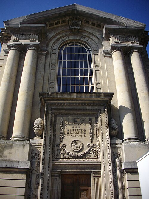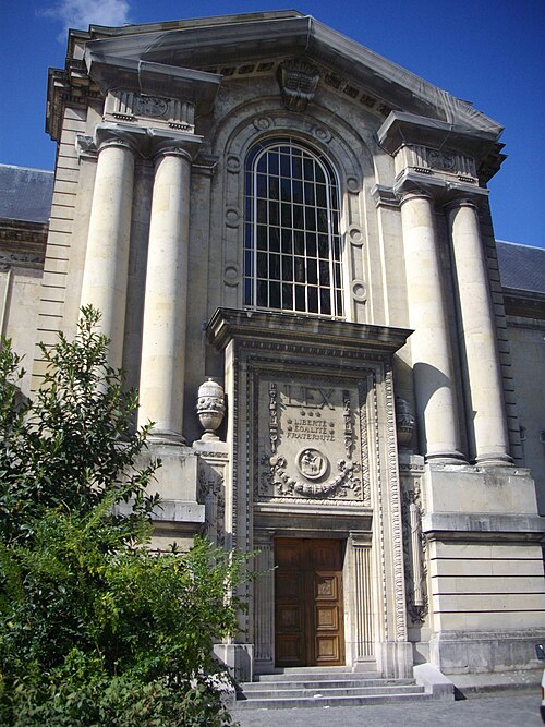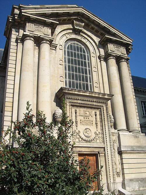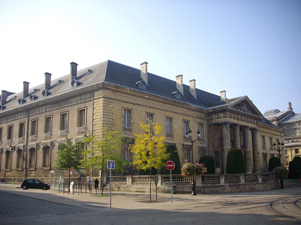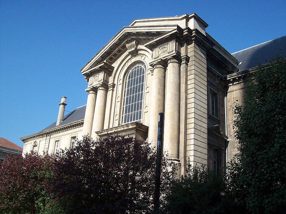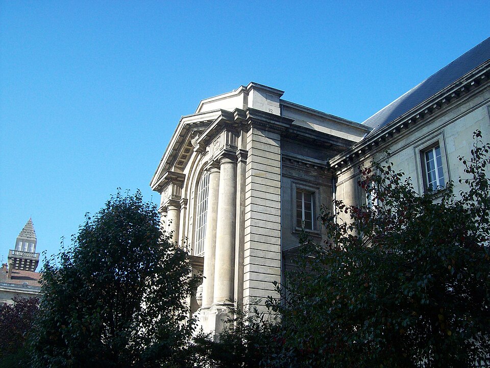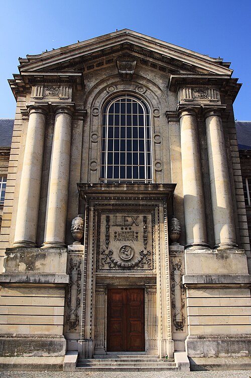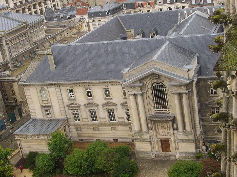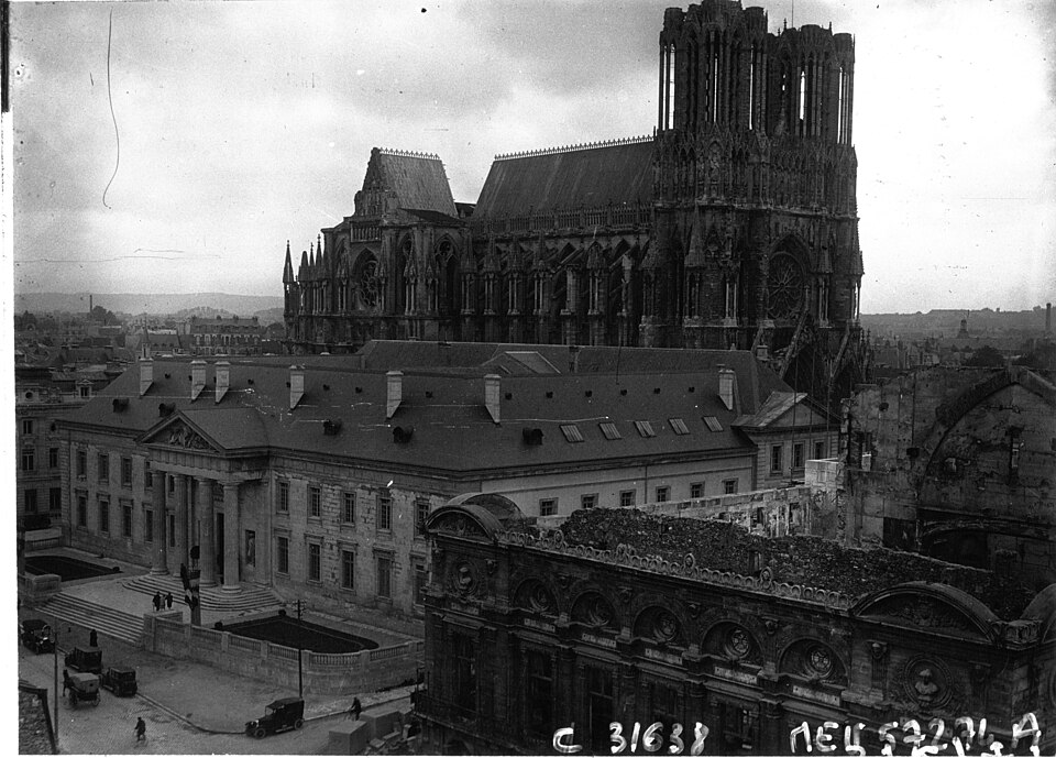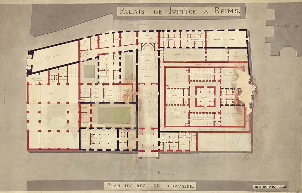 Le palais de justice de Reims, installé à l'emplacement de l'ancien hôtel-Dieu, occupe le secteur entre la place du Cardinal‑Luçon et la place Myron‑Herryck au centre‑ville et est desservi par les tramways A et B ainsi que par de nombreuses lignes de bus du réseau Grand Reims Mobilités. Il abrite notamment le tribunal judiciaire et le tribunal de commerce ; la ville dispose par ailleurs d'un conseil de prud'hommes et d'une cour d'appel, la fusion des tribunaux d'instance et de grande instance ayant conduit à la création du tribunal judiciaire au 1er janvier 2020. L'origine de l'hôtel‑Dieu remonte à la fondation de l'évêché au début du VIe siècle : il accueillait voyageurs, indigents et malades et fut doté par plusieurs évêques de Reims. Deux grandes salles destinées aux malades furent attribuées à Hincmar et l'établissement fut administré par le chapitre cathédral, qui y déléguait des religieux puis, par la suite, des religieuses de l'ordre de Saint‑Augustin. Au XIVe siècle l'hôpital comprenait deux quartiers distincts pour hommes et femmes, comportant plusieurs salles et lits, et accueillait également une crèche pour enfants abandonnés ; au fil des siècles le personnel et l'organisation évoluèrent, comme en 1750 où l'on dénombrait religieuses, ecclésiastiques, ouvriers et domestiques, ainsi que des médecins et autres officiers. En 1789, l'hôtel‑Dieu disposait de revenus mentionnés à 175 000 livres et possédait sa propre chapelle dédiée à saint Nicolas. Au XIXe siècle, des postes d'externe et d'interne furent créés, mais les salles de soins devenant inaptes, l'hôtel‑Dieu fut déplacé ; l'Hôpital‑général occupa alors successivement l'ancien collège des Jésuites puis l'abbaye Saint‑Remi en 1826. L'institution possédait un important patrimoine mobilier — tentures, peintures et objets — dont une partie figure aujourd'hui dans les collections du musée de la ville ou appartient à l'établissement hospitalier actuel. Plusieurs architectes se succédèrent pour transformer l'ancien hôtel‑Dieu en bâtiment judiciaire : Auguste Caristie et l'architecte municipal Nicolas Serrurier ont conçu des projets, et Narcisse Brunette a dirigé les travaux en dessinant notamment une façade de style néo‑grec, tout en conservant une façade de style Louis‑XV et les anciens celliers gothiques. Pour permettre l'agrandissement du côté de la cathédrale, une maison d'arrêt datant de 1835 fut supprimée lors des travaux au début du XXe siècle ; l'édifice ancien fut en grande partie rasé pour construire l'actuel palais de justice, mais une salle souterraine semblable à celle du palais du Tau fut conservée et classée en 1930. Le fronton de la façade d'entrée, côté place Myron‑Herryck, porte un bas‑relief réalisé par Riondet et De Maghellen représentant la Justice tenant glaive et balance, et une statue de l'Intégrité due au sculpteur Jean‑Baptiste Farochon se trouve sous le portique. Le monument est documenté par des vues de façades et des dessins anciens, dont un dessin de Maquart en 1845, et son mobilier et ses éléments décoratifs font l'objet de vestiges conservés ou exposés localement.