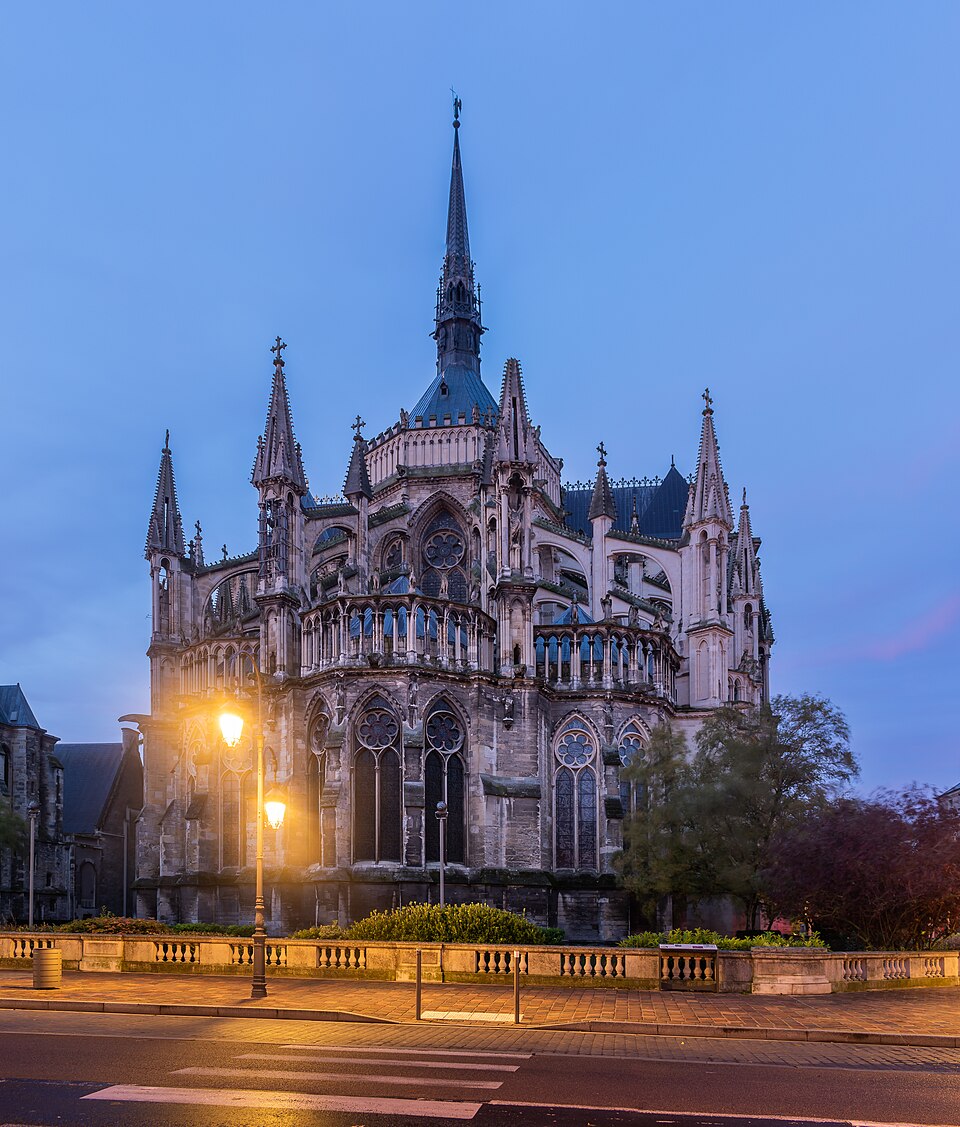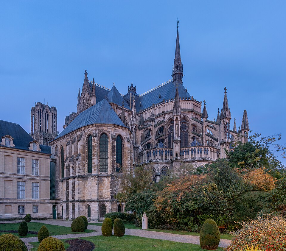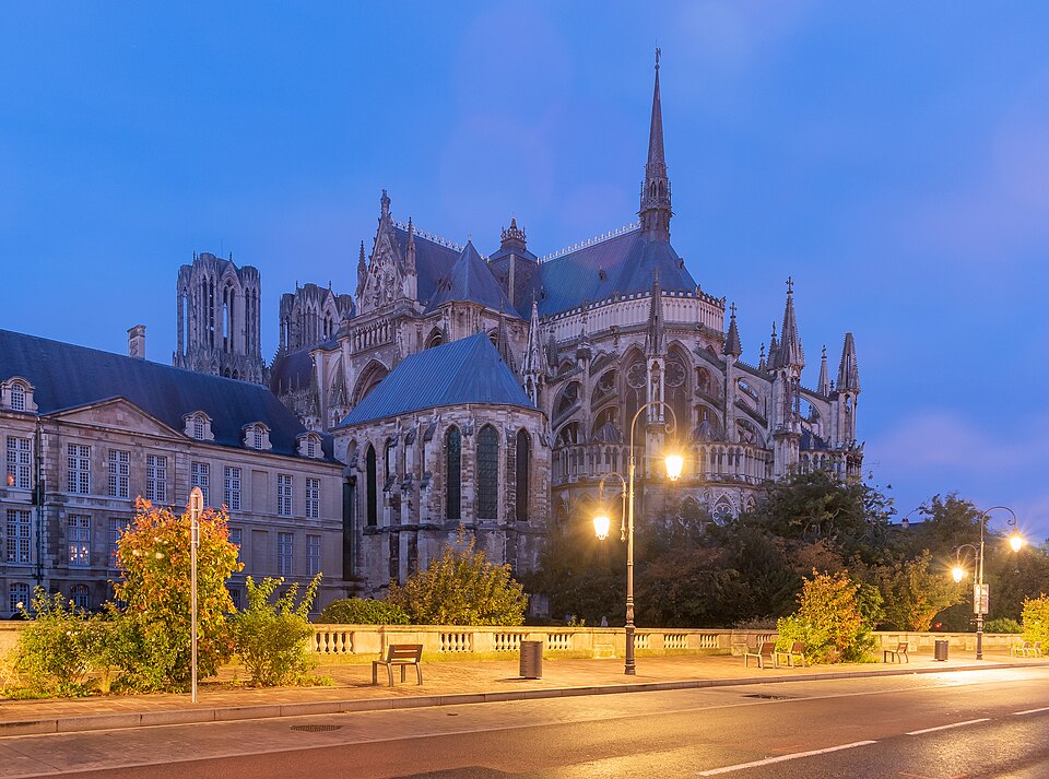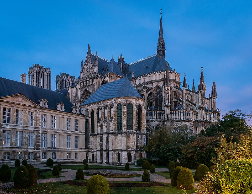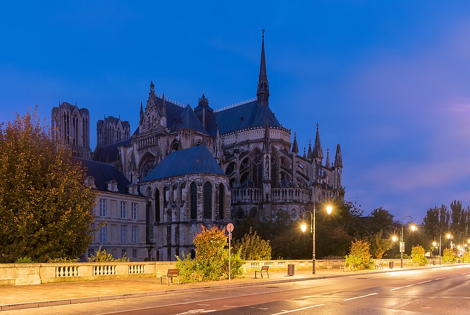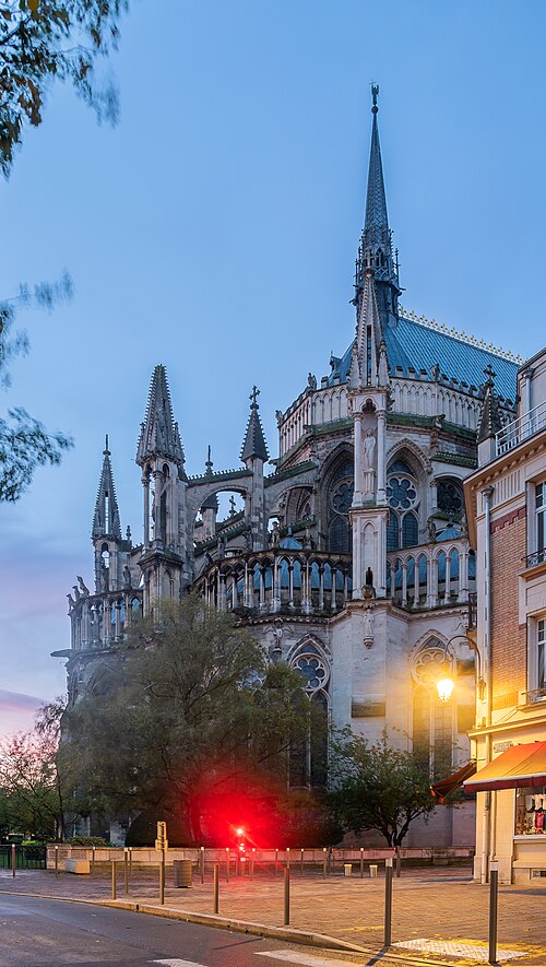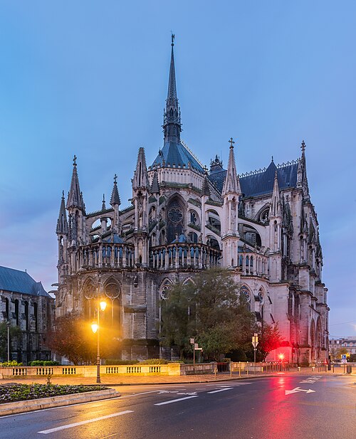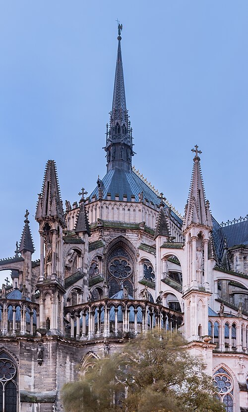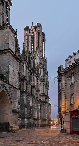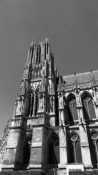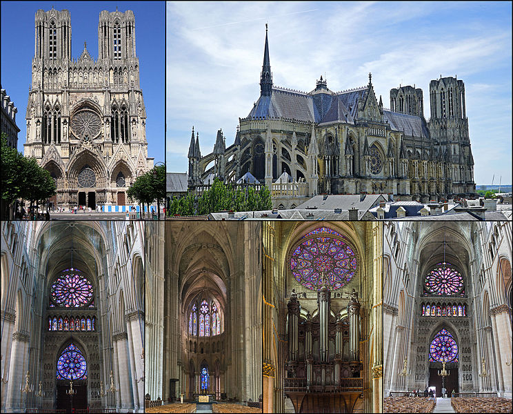 La cathédrale Notre-Dame de Reims, située dans la Marne en région Grand Est, est le siège de l'archidiocèse et la cathédrale métropolitaine de la province ecclésiastique de Reims. Dès le XIe siècle elle devint le lieu de la quasi-totalité des sacres des rois de France, conférant au monument un prestige national. Des textes et des vestiges, notamment ceux rapportés par Flodoard et Nicaise, attestent d'un lieu de culte rémois dès le Ve siècle, où se déroula le baptême de Clovis par l'évêque Rémi, dont la date fait l'objet de débats. Plusieurs cathédrales se sont succédé sur le même emplacement, la crypte primitive consacrée à saint Rémi servant de noyau aux reconstructions ultérieures. Après des remaniements carolingiens et des campagnes de reconstruction aux IXe et Xe siècles, l'archevêque Hincmar consacra une cathédrale en 862. Au milieu du XIIe siècle, d'importants travaux modifièrent la façade et le chœur, préparant la transition vers le premier art gothique. La construction de l'édifice actuel débute au début du XIIIe siècle ; la première pierre fut posée le 6 mai 1211 et plusieurs maîtres d'œuvre se succédèrent, dont Jean d'Orbais, Jean-le-Loup, Gaucher de Reims et Bernard de Soissons. Le triforium du chœur est amorcé dans les années 1220, le sanctuaire est livré en 1241 et la nef et la façade occidentale sont élevées dans la seconde moitié du XIIIe siècle, la grande phase de gros œuvre s'achevant vers 1275. La couverture définitive en plomb fut posée vers la fin du XIIIe siècle, la fourniture du matériau ayant été facilitée par des exemptions accordées en 1299. Un incendie en 1481 détruisit la charpente, le grand clocher central et les galeries de toiture ; la reconstruction bénéficia d'un soutien royal mais resta inachevée au début du XVIe siècle. Consacrée à la Vierge Marie, la cathédrale est l'une des réalisations majeures de l'art gothique en France, remarquable tant par son architecture que par une statuaire comptant 2 303 statues. La façade occidentale, commencée après 1252, comporte trois portails richement sculptés et une galerie des rois illustrant la vocation dynastique du lieu ; le portail central est exceptionnellement dédié à la Vierge. La cathédrale conserve de nombreux vitraux du XIIIe siècle et intègre, depuis le XXe siècle, des verrières contemporaines d'artistes tels que Marc Chagall et Imi Knoebel. Pendant la Première Guerre mondiale, la cathédrale, qualifiée de « cathédrale martyre », subit en 1914 un incendie ravageur provoqué par des bombardements : la charpente s'effondra, la grande rose et de nombreuses sculptures furent détruites et la ville fut largement atteinte. Au total, l'édifice reçut 288 obus pendant le conflit. Les travaux de restauration commencèrent en 1919 sous la direction d'Henri Deneux, avec l'aide de mécènes américains, et reposèrent sur la reconstruction de la charpente par une structure moderne en béton armé, inspirée de solutions anciennes. La remise en état de la façade occidentale et de sa statuaire s'est poursuivie par tranches depuis la fin du XXe siècle, avec des campagnes importantes entre 1989 et 2019. Classée au patrimoine mondial de l'UNESCO en 1991, la cathédrale demeure un haut lieu du tourisme local et a accueilli environ 1,5 million de visiteurs en 2007. Architectoniquement, elle présente une élévation à trois étages, une nef haute de 38 mètres, un plan en croix latine à chevet large et de grands arcs-boutants qui accentuent son élan vertical caractéristique du gothique. La pierre employée est principalement un calcaire lutétien extrait dans les collines au nord-ouest de Reims ; les restaurations du XXe siècle ont mobilisé des calcaires similaires ou de Courville pour respecter la patine originelle. Outre son rôle religieux et artistique, la cathédrale a été le théâtre d'événements symboliques, comme le sacre de Charles VII en 1429 lié à Jeanne d'Arc et la rencontre de réconciliation franco-allemande sous ses voûtes en 1962. Elle conserve un mobilier et des chapelles riches en œuvres, des orgues historiques, un carillon et une maîtrise de chant active depuis 1285, témoins de sa vocation liturgique et musicale continue. Tous les rois capétiens se firent sacrer à Reims, à l'exception de sept d'entre eux, ce qui explique l'importance politique et mémorielle attachée au site.