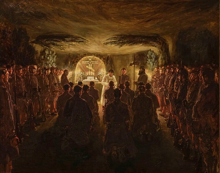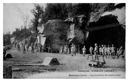 Les carrières dites de l'Infirmerie et du Premier Zouave sont d'anciennes exploitations souterraines de calcaire, transformées en cantonnement par les soldats français pendant la Première Guerre mondiale et ornées de nombreuses sculptures et inscriptions. Elles se situent à Confrécourt, près de Vic‑sur‑Aisne, sur la commune de Nouvron‑Vingré ; l'une d'elles est visitable avec les guides de l'association Soissonnais 14‑18. Le site de Confrécourt comprenait avant 1914 une vaste ferme d'origine monastique, attestée depuis l'époque carolingienne, installée au bord du plateau du Soissonnais et fortifiée, position qui en fit un lieu de combats intenses à la fin de la bataille de la Marne. À partir de septembre 1914 la région fut disputée entre forces françaises et allemandes ; le recul britannique fin septembre fixa le front et Confrécourt se retrouva en retrait, à quelques centaines de mètres des premières lignes. Les belligérants consolidèrent alors leurs défenses : tranchées et carrières furent aménagées pour abriter les troupes et se protéger des bombardements qui se multiplièrent dès le 14 septembre 1914. L'occupation des lieux fut presque continue pendant toute la guerre ; la ferme fut entièrement détruite et il ne subsiste aujourd'hui que des contreforts du soubassement au sud‑ouest. Le secteur resta relativement calme jusqu'en mars 1917, période où l'armée allemande se replaça sur la ligne Hindenburg, provoquant le repli temporaire des Français hors des carrières ; ces dernières furent de nouveau occupées lors des mouvements de 1918 et la zone sortit définitivement du combat à partir d'août 1918. Les carrières, exploitées depuis le Moyen Âge et utilisées pour la reconstruction de la ferme à la fin du XIVe siècle, présentent une extraction méthodique du calcaire vergelé selon la technique des « piliers tournés », qui a assuré une bonne stabilité du ciel de carrière et leur a permis d'offrir un refuge sûr.
