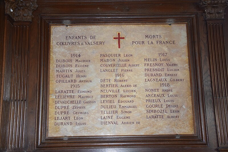 L'église Saint‑Médard‑et‑Saint‑Gildard, située sur la commune de Cœuvres‑et‑Valsery dans l'Aisne, rassemble des éléments des XIIe, XIIIe et XVIe siècles. Après la Première Guerre mondiale, il ne subsistait de l'édifice que la base du chœur et du clocher ainsi qu'une partie des deux nefs accolées. L'édifice est classé au titre des monuments historiques depuis 1920. Des images et notices sont accessibles sur Wikimedia Commons et dans plusieurs ressources spécialisées, notamment Mérimée, Clochers de France et l'Observatoire du patrimoine religieux, ainsi que sur divers portails thématiques (catholicisme, monuments historiques, Aisne, architecture chrétienne).