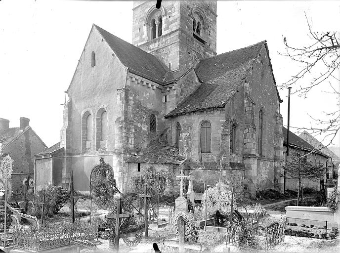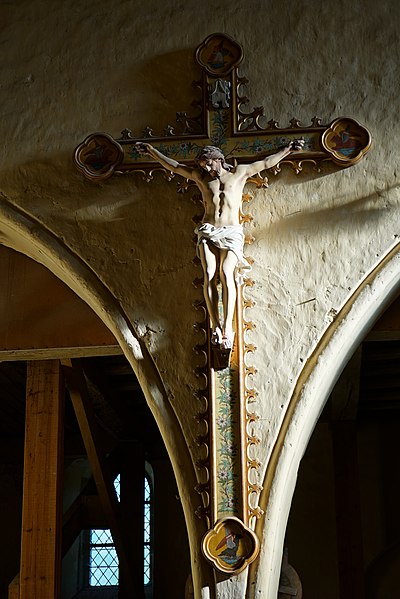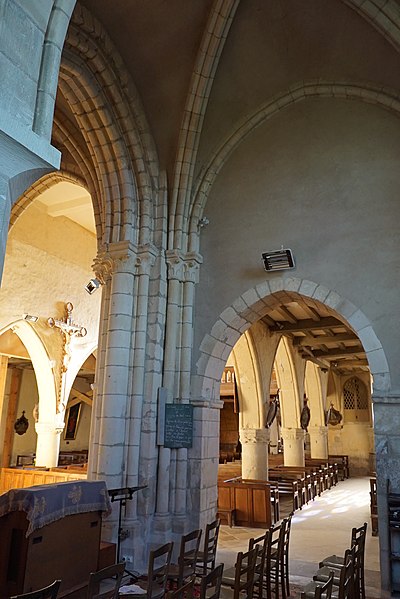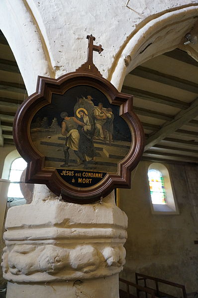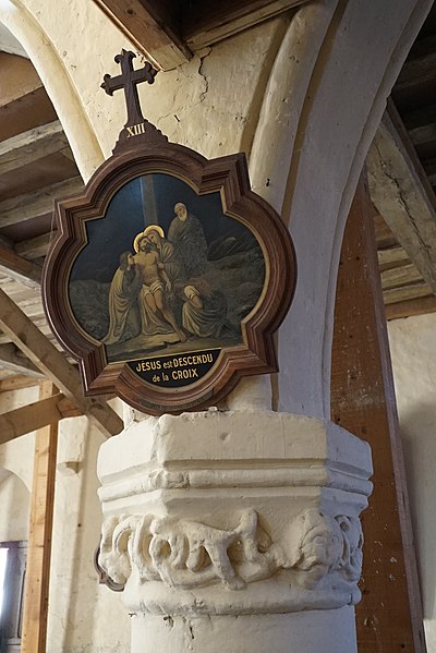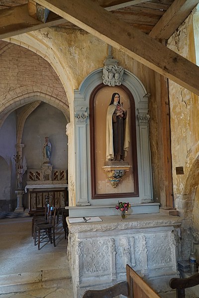 Des photographies montrent l'église dans son environnement villageois, le détail du portail sud, l'autel avec son baldaquin, la nef ainsi que le chevet plat et le transept nord.