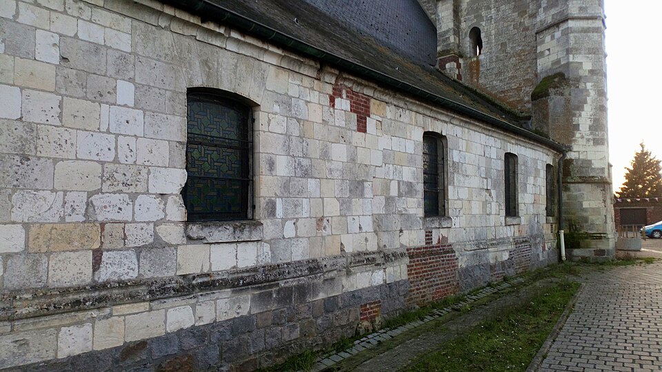 Le tympan, sculpté dans la pierre de Vaux-sur-Somme et daté entre 1515 et 1528, est l'élément le plus remarquable de la façade; il représente l'entrée du Christ à Jérusalem le jour des Rameaux et a été restauré au XIXe siècle par les frères Duthoit. La scène montre au premier plan le Christ sur un âne, suivi des apôtres, accueilli devant une porte fortifiée où un personnage étend un tissu sous les pas de l'âne et d'autres lancent des gerbes de feuilles depuis la porte; en arrière-plan apparaissent des fortifications, des personnages perchés dans les arbres et un moulin. Protégées par un auvent, ces sculptures souffrent néanmoins de l'érosion.