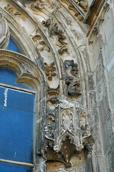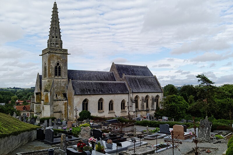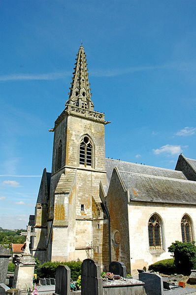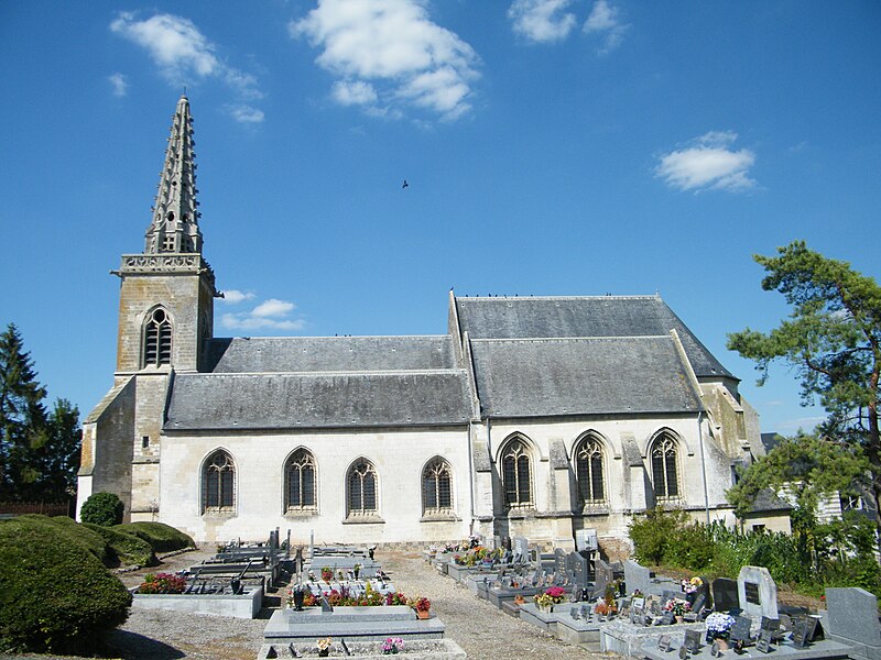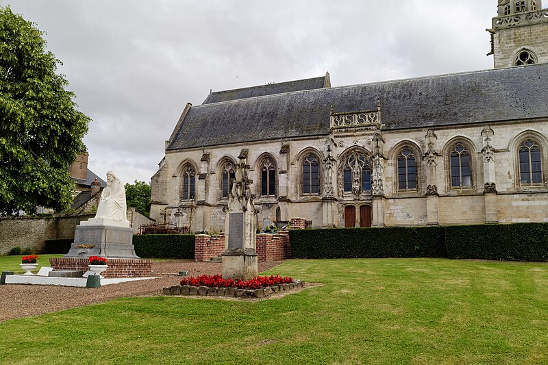 Le portail flamboyant du bas-côté nord, demeuré intact, est décoré de statues représentant saint Riquier en mitre et crosse au centre, saint Pierre tenant sa clé à droite et saint Adrien avec son enclume à gauche. Aux écoinçons supérieurs, on reconnaît, sculptés en médaillons, les emblèmes de Louis XII (le porc-épic) et de François Ier (la salamandre) accompagnés des dates 1510 et 1515. La flèche du clocher date du XVIIe siècle et le clocher lui-même a été reconstruit après la guerre.