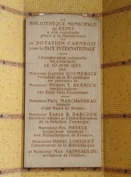 La Bibliothèque Carnégie de Reims, intégrée au réseau des médiathèques municipales, est dédiée à l'étude et à la conservation du patrimoine. Construite en style Art déco à partir de 1921, elle a été inaugurée le 10 juin 1928 par le président Gaston Doumergue et l'ambassadeur américain Myron T. Herrick. Elle doit son nom au philanthrope américain Andrew Carnegie et sa construction a été rendue possible par une aide exceptionnelle de la dotation Carnegie pour la paix internationale.
