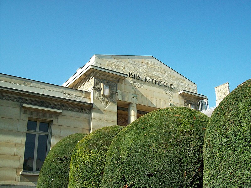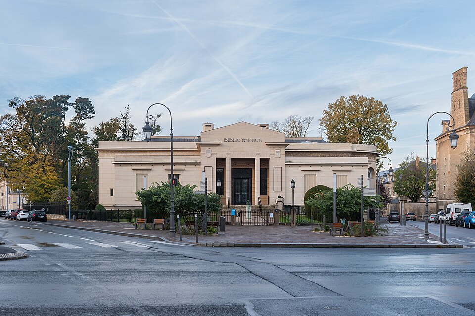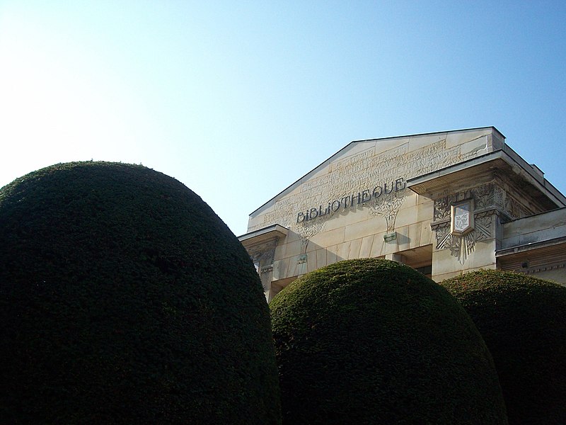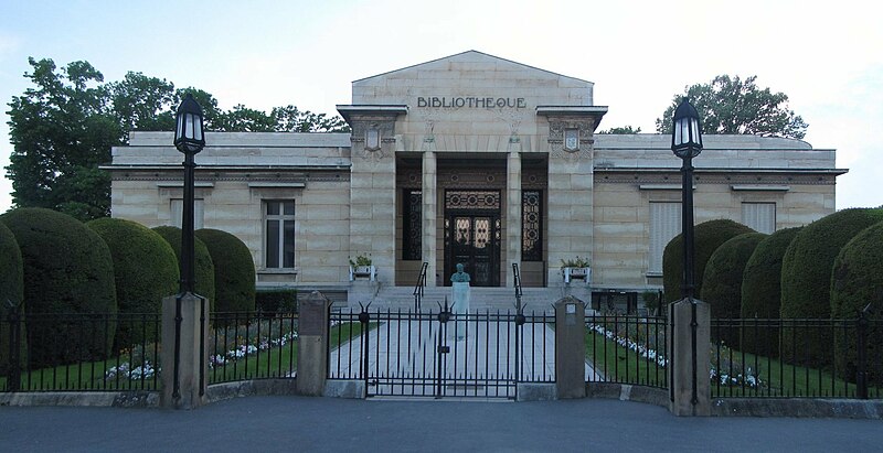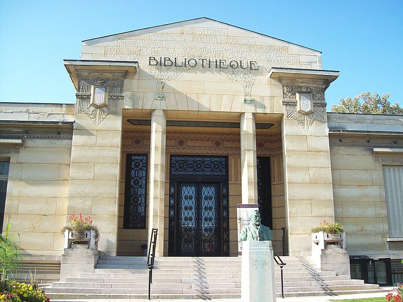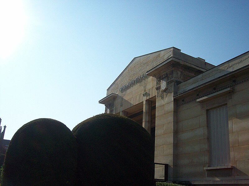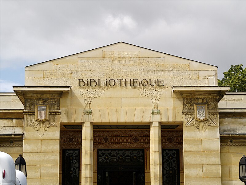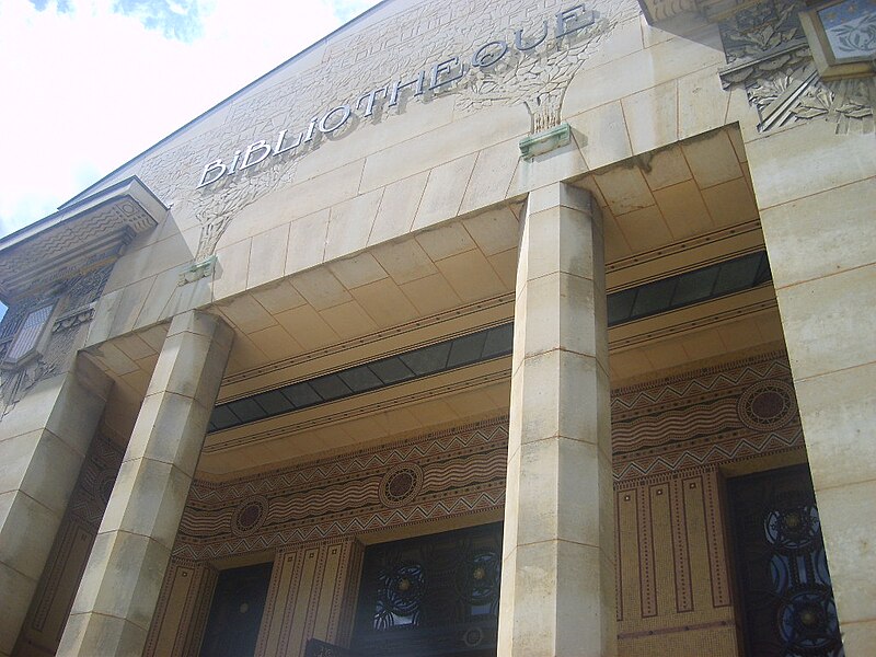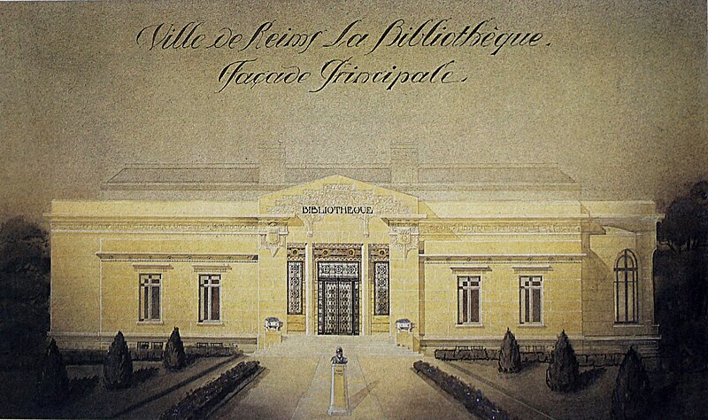 Les plans furent dessinés par l'architecte Max Sainsaulieu, qui effectua un voyage d'étude préalable pour intégrer les dernières évolutions de la bibliothéconomie. Le bâtiment est aujourd'hui considéré comme un chef-d'œuvre de l'Art déco en France et présente de nombreuses œuvres d'art et d'artisanat appliqué. La grande porte d'entrée en fer forgé, réalisée par l'entreprise Schwartz-Haumont, fut primée à l'Exposition des arts décoratifs de 1925, et les motifs du fronton sont l'œuvre du sculpteur Édouard Sediey. Les mosaïques du péristyle conçues par A. Biret et la décoration du hall, exécutée par les marbreries Merbès-Sprimont d'après des cartons d'Henri Sauvage, illustrent deux thèmes complémentaires, l'activité intellectuelle (poésie, philosophie, théologie, histoire, législation, médecine, chimie, arts décoratifs, beaux-arts, musique) et l'activité physique ou commerciale (imprimerie, commerce, tissage, agriculture, viticulture, sport, aviation, transport, finance). Les murs du hall sont lambrissés de panneaux en onyx d'Algérie et de bandes de marbre vert, et le lustre fut dessiné par le maître verrier rémois Jacques Simon. La salle de lecture est éclairée par trois baies vitrées et une verrière zénithale dessinées par le maître verrier nancéien Jacques Gruber, et ses peintures à motifs floraux sont de Madeleine Lacourt. Le bâtiment a fait l'objet d'une restauration complète entre 2003 et 2005 par les architectes Jean-Loup Roubert et Jacques Bléhaut.