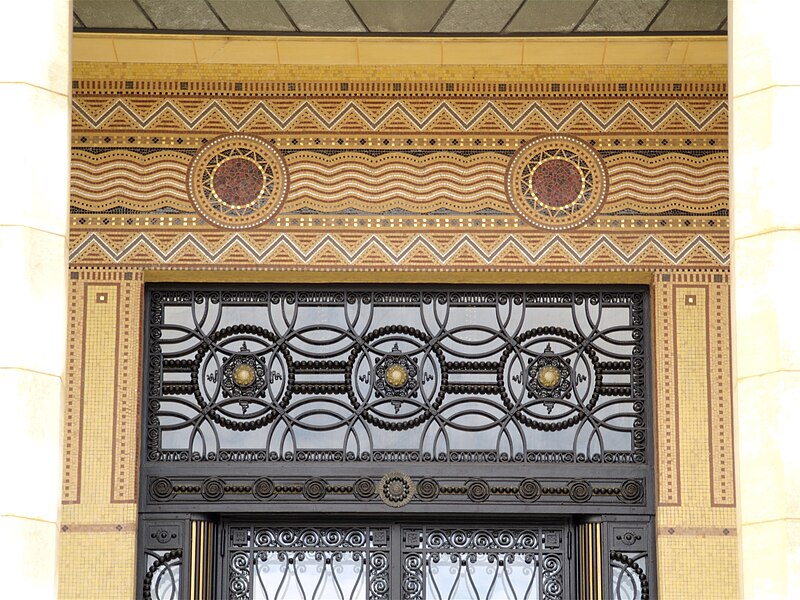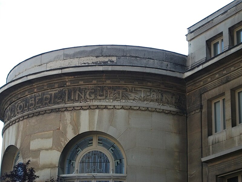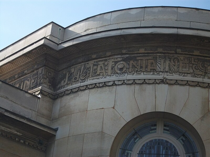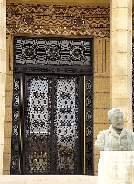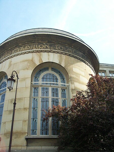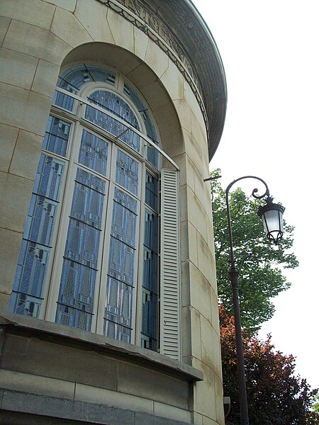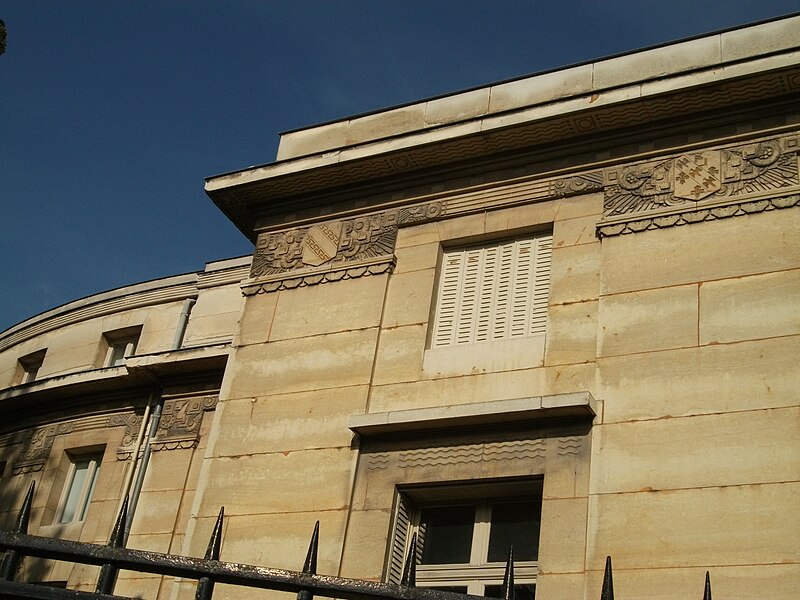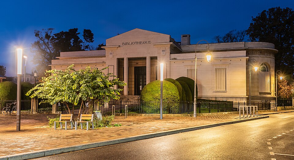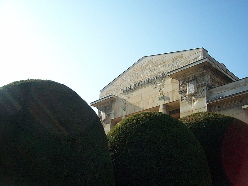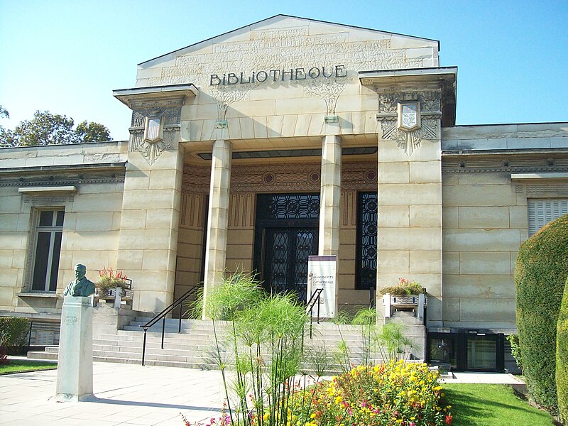 Les plans furent dessinés par l'architecte Max Sainsaulieu, qui effectua un voyage d'étude préalable pour intégrer les dernières évolutions de la bibliothéconomie. Le bâtiment est aujourd'hui considéré comme un chef-d'œuvre de l'Art déco en France et présente de nombreuses œuvres d'art et d'artisanat appliqué. La grande porte d'entrée en fer forgé, réalisée par l'entreprise Schwartz-Haumont, fut primée à l'Exposition des arts décoratifs de 1925, et les motifs du fronton sont l'œuvre du sculpteur Édouard Sediey. Les mosaïques du péristyle conçues par A. Biret et la décoration du hall, exécutée par les marbreries Merbès-Sprimont d'après des cartons d'Henri Sauvage, illustrent deux thèmes complémentaires, l'activité intellectuelle (poésie, philosophie, théologie, histoire, législation, médecine, chimie, arts décoratifs, beaux-arts, musique) et l'activité physique ou commerciale (imprimerie, commerce, tissage, agriculture, viticulture, sport, aviation, transport, finance). Les murs du hall sont lambrissés de panneaux en onyx d'Algérie et de bandes de marbre vert, et le lustre fut dessiné par le maître verrier rémois Jacques Simon. La salle de lecture est éclairée par trois baies vitrées et une verrière zénithale dessinées par le maître verrier nancéien Jacques Gruber, et ses peintures à motifs floraux sont de Madeleine Lacourt. Le bâtiment a fait l'objet d'une restauration complète entre 2003 et 2005 par les architectes Jean-Loup Roubert et Jacques Bléhaut.