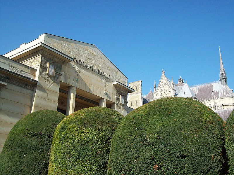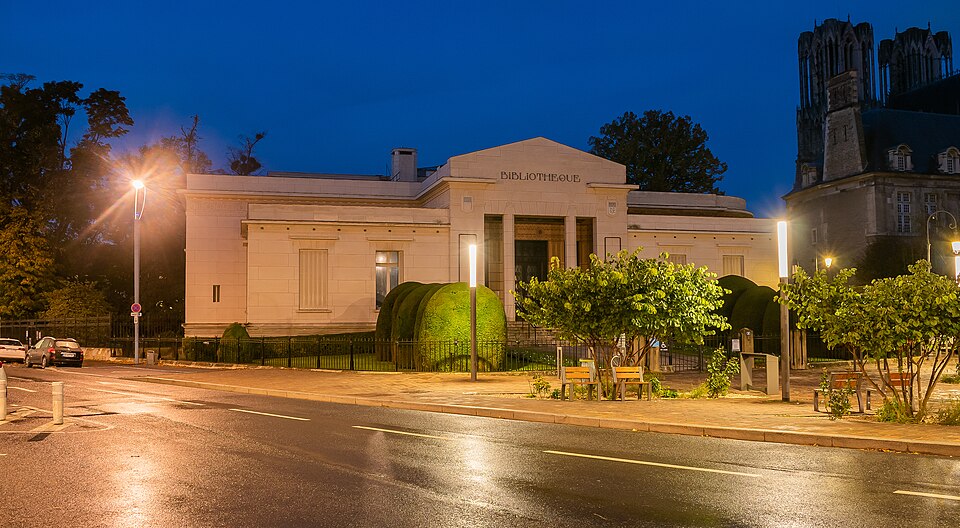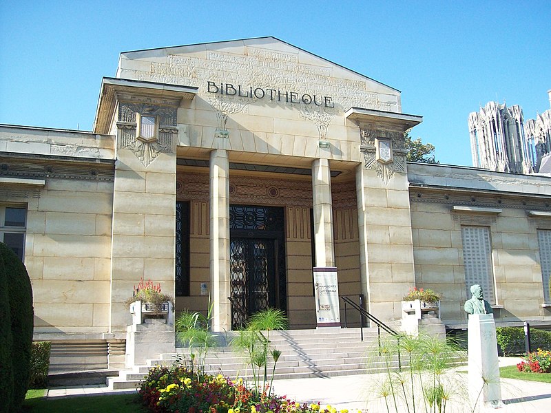La genèse des collections municipales remonte à la confiscation en 1764 des biens du collège jésuite après la suppression de la Compagnie de Jésus. Elles furent ensuite enrichies par les saisies révolutionnaires, qui apportèrent notamment les fonds des abbayes Saint-Remi et Saint-Nicaise ainsi que celui du chapitre cathédral. À cette époque, on estimait les dépôts littéraires de la ville à 65 000 imprimés et 1 000 manuscrits. Au XIXe siècle, la bibliothèque reçut divers dons, dont celui du sénateur Victor Diancourt, et une salle de lecture ouvrit en 1818 au premier étage de l'hôtel de ville; Louis Paris, Eugène Courmeaux et Henri Jadart se succédèrent ensuite comme bibliothécaires-archivistes.